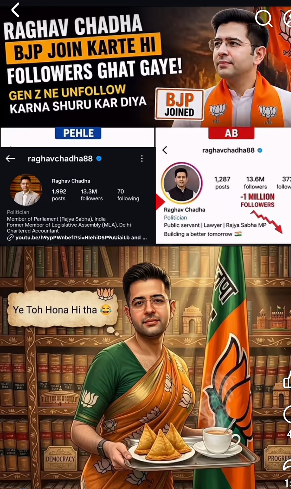 ହଁ, ଦରସଲ, ରାଘବ ଚଡ଼୍ଧାକୁ ଆରମ୍ଭରୁ ଏକ ଯୁବ, ତେଜସ୍ୱୀ ଏବଂ ଜନତା ସହିତ ଜୋଗାଯୋଗ ଥିବା ନେତୃତ୍ୱ ଭାବେ ମନେ ରଖାଯାଇଥିଲା। ଡିଲିରେ ଆମ ଆଦମୀ ପାର୍ଟିରୁ ସେ ଏକ ସାମାଜିକ ସଂଘଠନରେ ଗୋଟେ ପ୍ରଭାବଶାଳୀ ସାଂସଦ ଭାବେ ପରିଚିତ ହୋଇଥିଲେ, ବିଶେଷକରି ତାଙ୍କର ଚୁଷ୍ଟ ପ୍ରଶ୍ନ ଓ ନିୟୋଜନ କାର୍ଯ୍ୟରେ। କିନ୍ତୁ ଯେତେବେଳେ ସେ ଅଚାନକ ବିଜେପିରେ ଯୋଗଦେଲେ, ଲୋକମାନେ ଏହିଟି ତାଙ୍କର ରାଜନୈତିକ କାର୍ଯ୍ୟକ୍ରମର ଗୋଟେ ବଡ଼ ପରିବର୍ତ୍ତନ ଭାବେ ଗ୍ରହଣ କରିଛନ୍ତି। ବହୁତେ ଲୋକ କହିଛନ୍ତି ଯେ, ସେ ଶାୟଦ ତାଙ୍କର ପରିଚୟ ହରାଇ ଯାଉଛନ୍ତି କିମ୍ବା ତାଙ୍କର ଛବିକୁ ପରିବର୍ତ୍ତନ କରିବାକୁ ଚାହୁଁଛନ୍ତି, ଯାହାଦ୍ୱାରା ସେ ପାର୍ଟି ଭିତରେ ନୂତନ ଏକ ସ୍ଥାନ ଗଠନ କରିପାରିବେ। ଏହି ପଦକ୍ଷେପ ଏକମাত্ৰ ପାର୍ଟି ରେଖାକୁ ନୁହେଁ, ବରଂ ଜନତା ମଧ୍ୟରେ ତାଙ୍କ ପ୍ରତି ବିଶ୍ୱାସରେ ପାର୍ଠିତ କରିଛି।