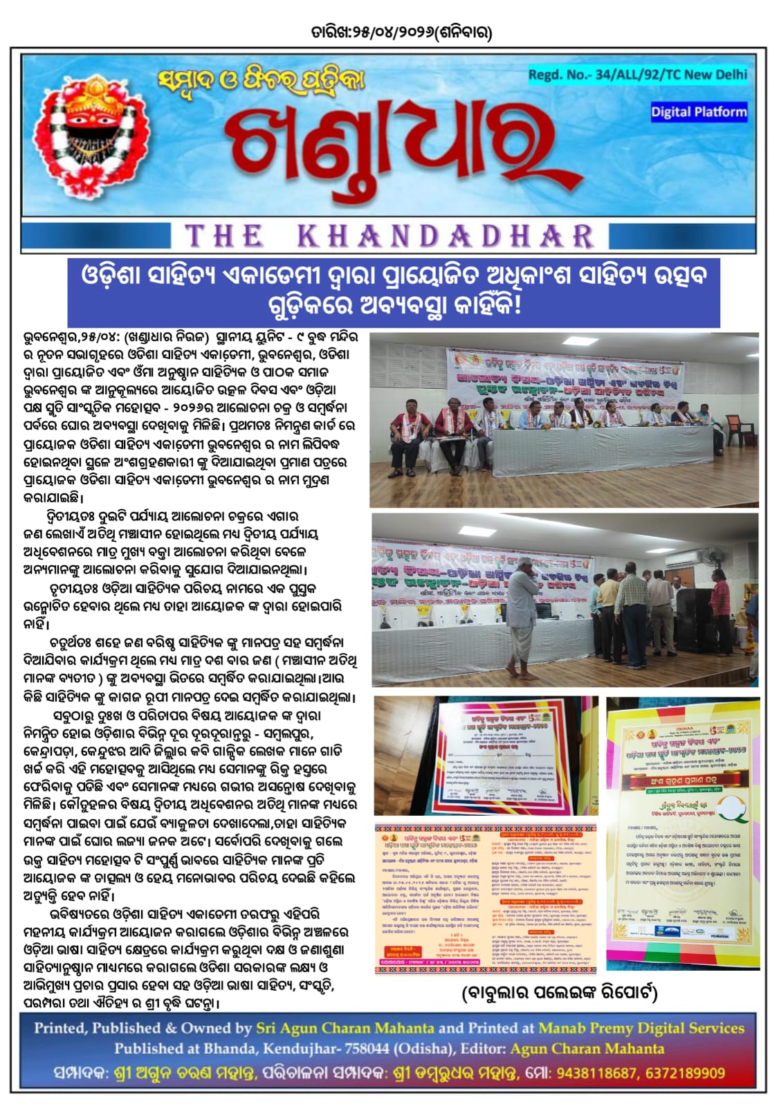 ଭୁବନେଶ୍ୱର,୨୫/୦୪ : ( ଖଣ୍ଡାଧାର ନିଉଜ ) ସ୍ଥାନୀୟ ୟୁନିଟ - ୯ ବୁଦ୍ଧ ମନ୍ଦିର ର ନୂତନ ସଭାଗୃହରେ ଓଡିଶା ସାହିତ୍ୟ ଏକାଡେ଼ମୀ, ଭୁବନେଶ୍ଵର ,ଓଡିଶା ଦ୍ବାରା ପ୍ରାୟୋଜିତ ଏବଂ ଓଁମା ଅନୁଷ୍ଠାନ ସାହିତ୍ୟିକ ଓ ପାଠକ ସମାଜ ଭୁବନେଶ୍ବର ଙ୍କ ଆନୁକୂଲ୍ୟରେ ଆୟୋଜିତ ଉତ୍କଳ ଦିବସ ଏବଂ ଓଡ଼ିଆ ପକ୍ଷ ସ୍ମୃତି ସାଂସ୍କୃତିକ ମହୋତ୍ସବ - ୨୦୨୬ର ଆଲୋଚନା ଚକ୍ର ଓ ସମ୍ବର୍ଦ୍ଧନା ପର୍ବରେ ଘୋର ଅବ୍ୟବସ୍ଥା ଦେଖିବାକୁ ମିଳିଛି। ପ୍ରଥମତଃ ନିମନ୍ତ୍ରଣ କାର୍ଡ ରେ ପ୍ରାୟୋଜକ ଓଡିଶା ସାହିତ୍ୟ ଏକାଡେ଼ମୀ ଭୁବନେଶ୍ଵର ର ନାମ ଲିପିବଦ୍ଧ ହୋଇନଥିବା ସ୍ଥଳେ ଅଂଶଗ୍ରହଣକାରୀ ଙ୍କୁ ଦିଆଯାଇଥିବା ପ୍ରମାଣ ପତ୍ରରେ ପ୍ରାୟୋଜକ ଓଡିଶା ସାହିତ୍ୟ ଏକାଡେ଼ମୀ ଭୁବନେଶ୍ଵର ର ନାମ ମୁଦ୍ରଣ କରାଯାଇଛି।