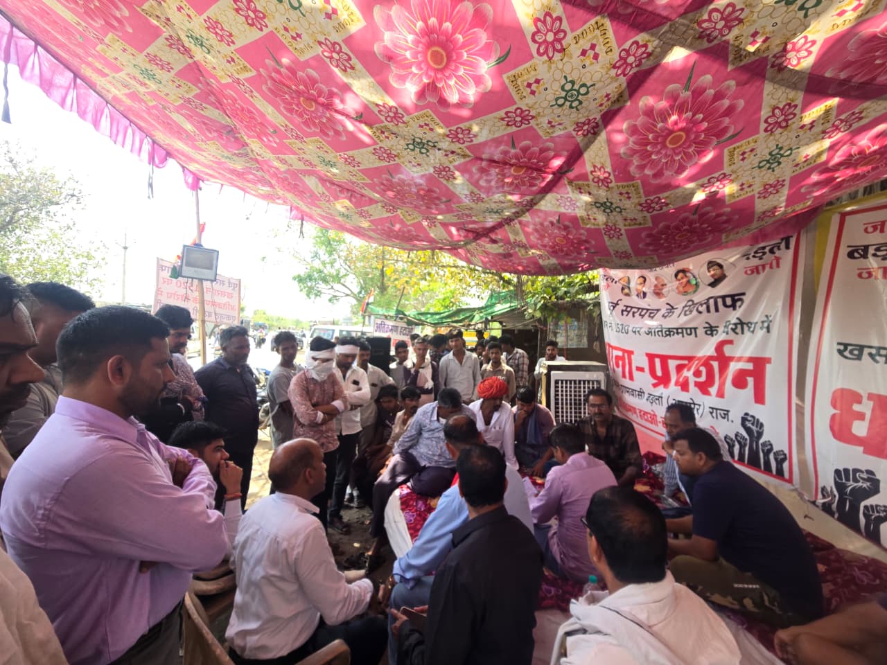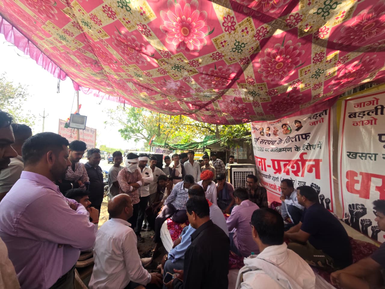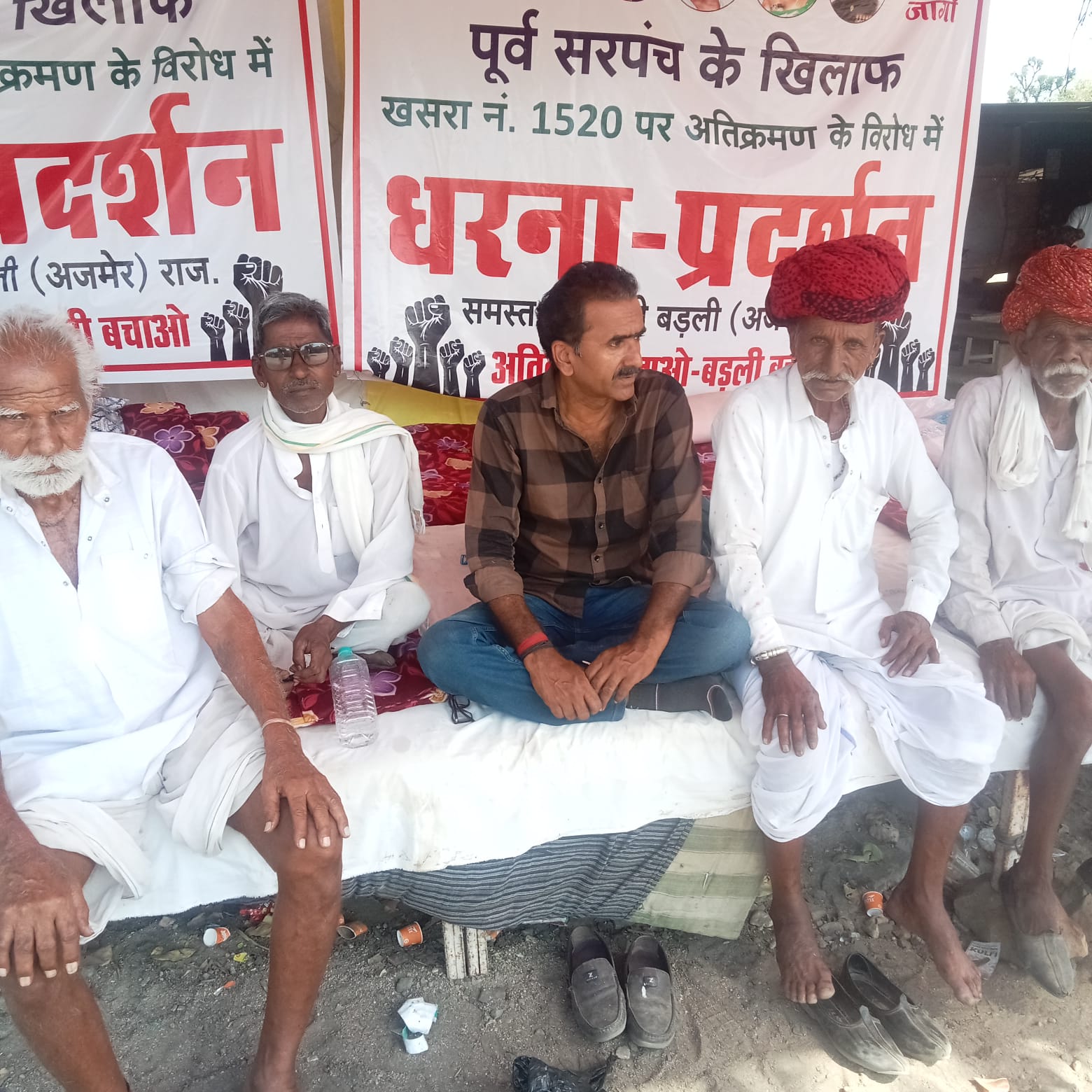 भिनाय क्षेत्र के ग्राम बड़ली में आबादी भूमि पर अतिक्रमण हटाने को लेकर धरने पर बैठे धरनार्थी श्री तेजेन्द्र सिंह राठौड़ ओर इनके समर्थन में बैठे हुए ग्रामीण जन,