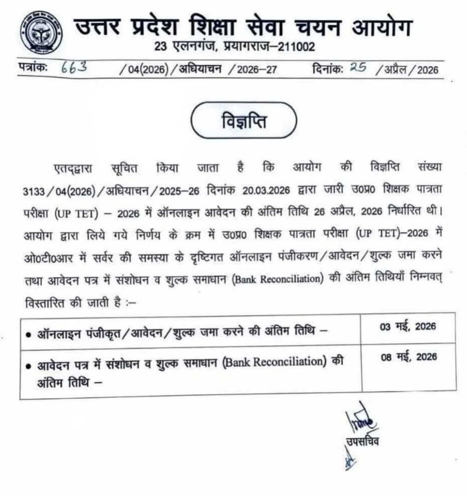 ЁЯУв UPTET 2026: рдЖрд╡реЗрджрди рддрд┐рдерд┐ рдмрдврд╝рд╛рдИ рдЧрдИ тАУ рдорд╣рддреНрд╡рдкреВрд░реНрдг рд╕реВрдЪрдирд╛