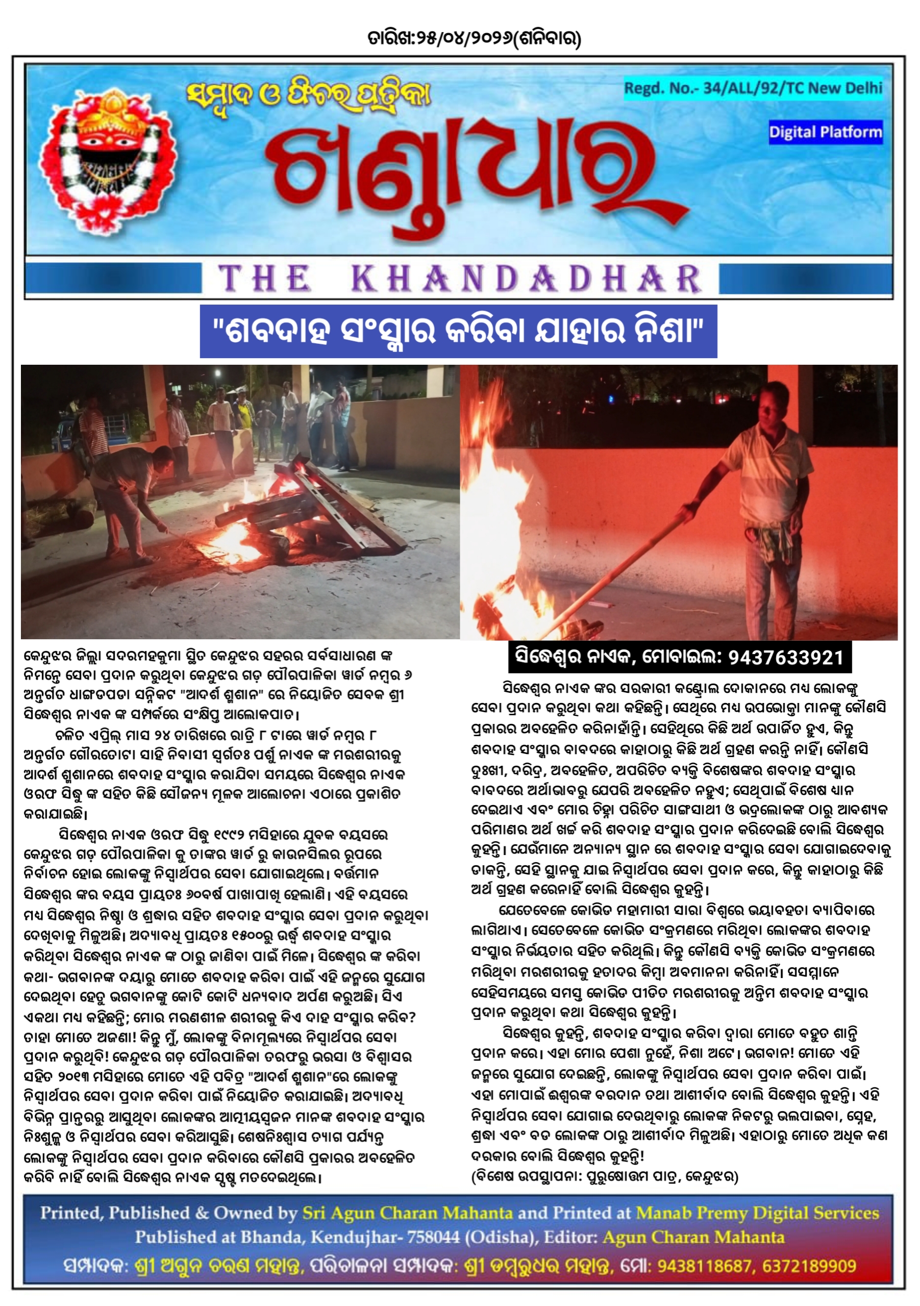 ଚଳିତ ଏପ୍ରିଲ୍ ମାସ ୨୪ ତାରିଖରେ ରାତ୍ରି ୮ ଟାରେ ୱାର୍ଡ ନମ୍ବର ୮ ଅନ୍ତର୍ଗତ ଗୌରତୋଟା ସାହି ନିବାସୀ ସ୍ବର୍ଗତଃ ପର୍ଶୁ ନାଏକ ଙ୍କ ମରଶରୀରକୁ ଆଦର୍ଶ ଶ୍ମଶାନରେ ଶବଦାହ ସଂସ୍କାର କରାଯିବା ସମୟରେ ସିଦ୍ଧେଶ୍ଵର ନାଏକ ଓରଫ ସିଦ୍ଧୁ ଙ୍କ ସହିତ କିଛି ସୌଜନ୍ୟ ମୂଳକ ଆଲୋଚନା ଏଠାରେ ପ୍ରକାଶିତ କରାଯାଇଛି।