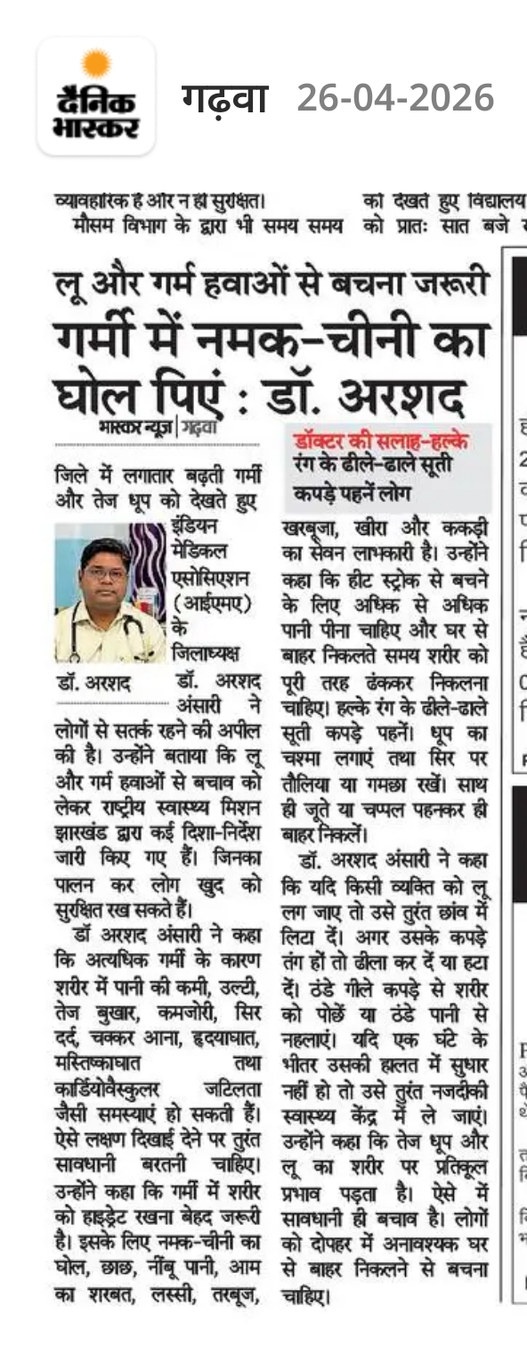 गढ़वा। जिले में लगातार बढ़ रही भीषण गर्मी और तीखी धूप को देखते हुए इंडियन मेडिकल एसोसिएशन (IMA) के जिलाध्यक्ष डॉ. अरशद अंसारी ने आम जनता के लिए स्वास्थ्य एडवाइजरी जारी की है। उन्होंने लोगों से अपील की है कि वे लू (Heat Wave) और गर्म हवाओं से बचने के लिए विशेष सावधानी बरतें।