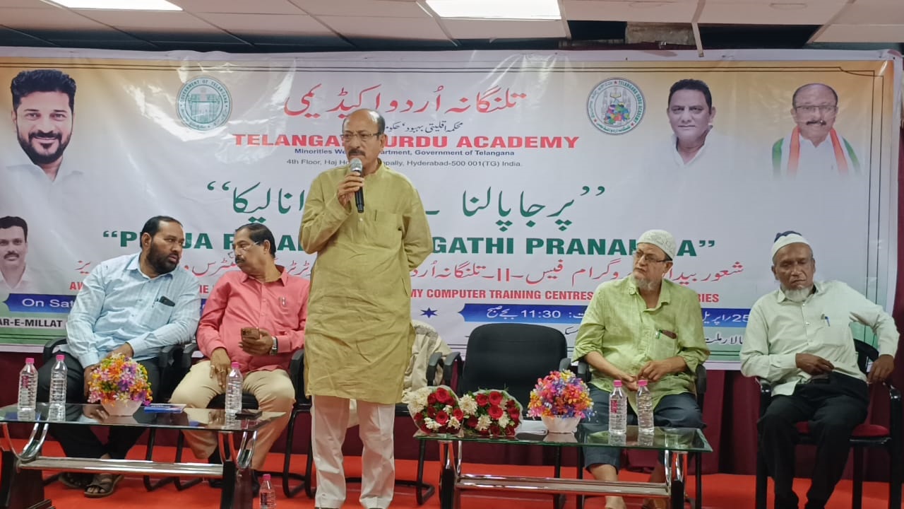 तेलंगाना उर्दू अकादमी के प्रेसिडेंट श्री ताहिर बिन हमदान के भाषण में, प्रजा पालना प्रगति परना लेका प्रोग्राम, फेज़ II के तहत वेलफेयर स्कीमों के बारे म