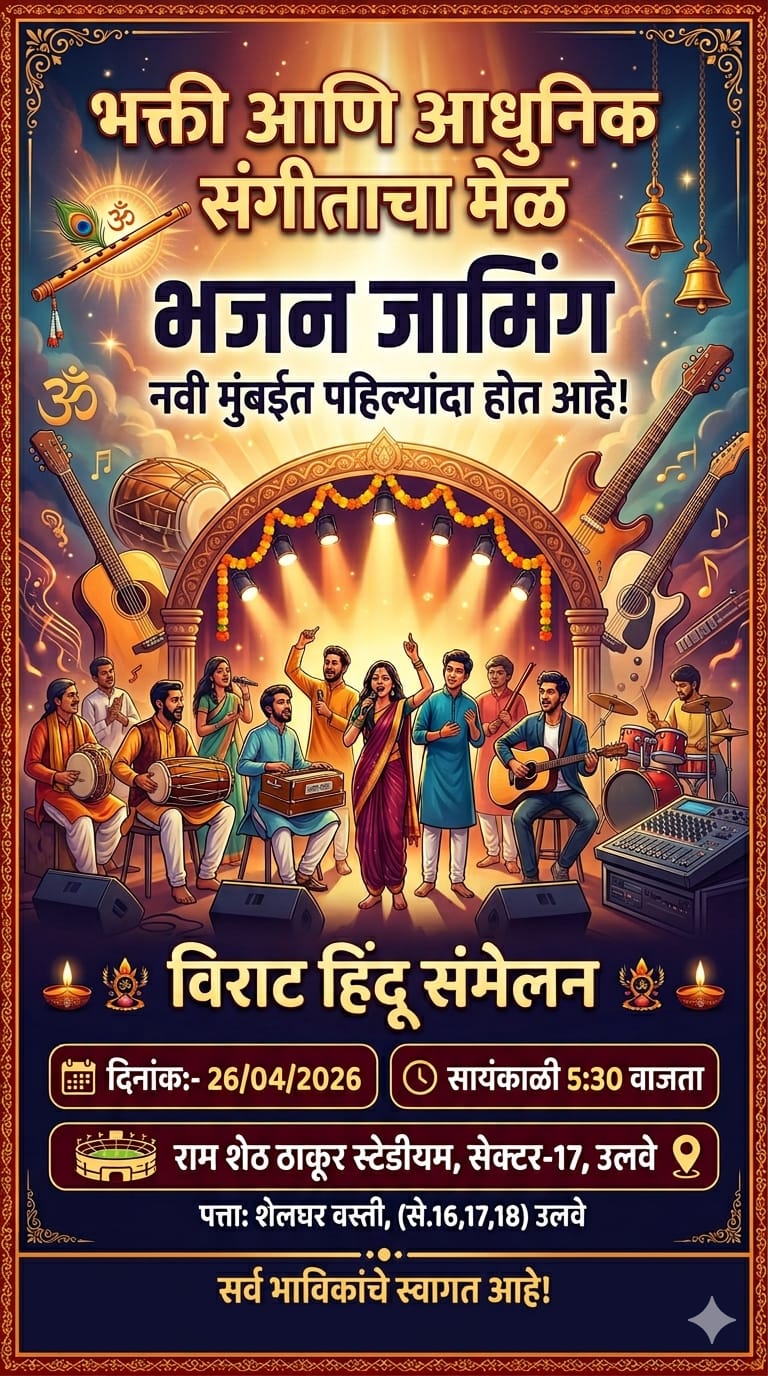 नवी मुंबई: उलवे स्थित रामशेठ ठाकुर स्टेडियम में आयोजित विराट हिंदू सम्मेलन तथा ‘भजन जामिंग’ कार्यक्रम का समापन बेहद भव्य और उत्साहपूर्ण माहौल में हुआ। ‘विराट हिंदू सम्मेलन’ के तहत आयोजित इस कार्यक्रम में बड़ी संख्या में श्रद्धालुओं, युवाओं और संगीत प्रेमियों ने भाग लिया।