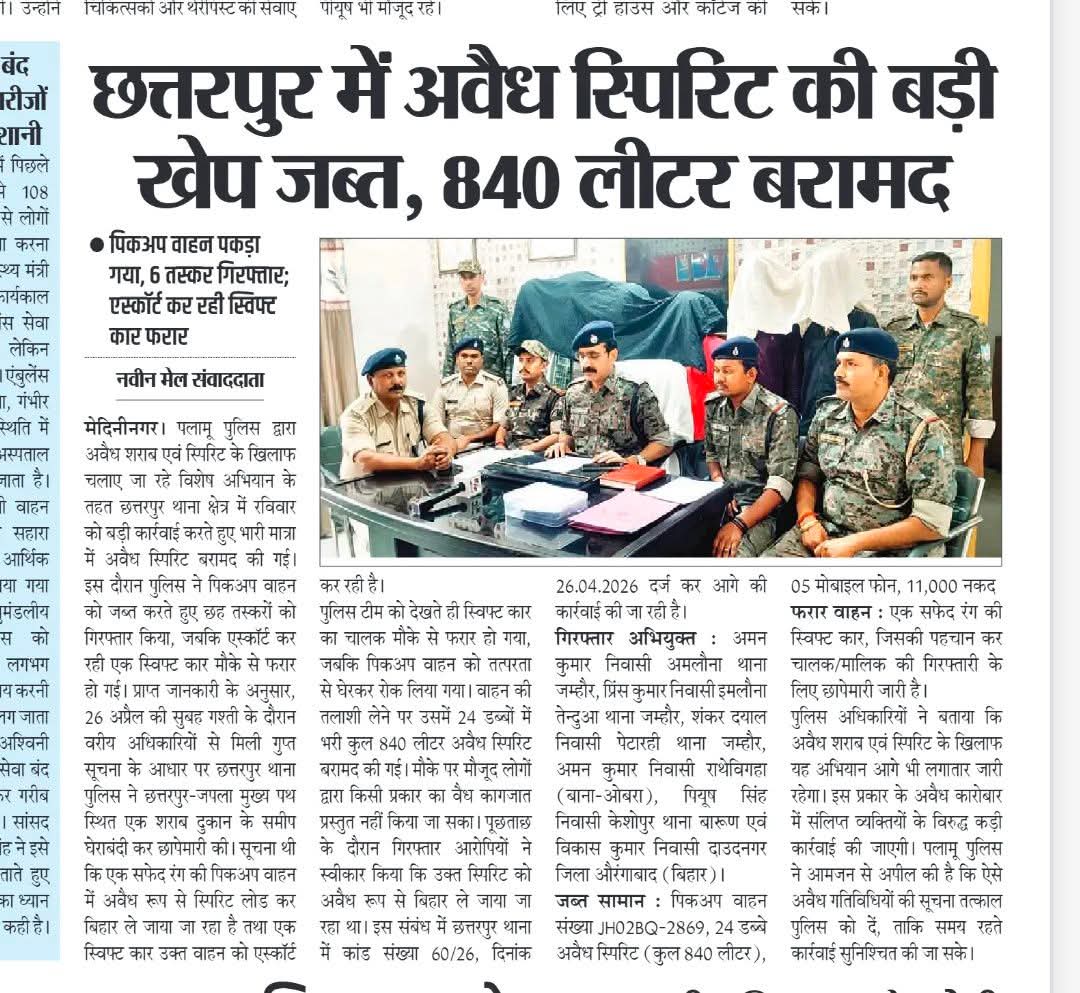 ​जानकारी के अनुसार, 26 अप्रैल की सुबह पुलिस को गुप्त सूचना मिली थी कि छतरपुर-जपला मुख्य पथ स्थित एक शराब दुकान के पास से सफेद रंग की पिकअप वैन में अवैध स्पिरिट लादकर बिहार ले जाया जा रहा है। सूचना मिलते ही पुलिस टीम ने घेराबंदी कर छापेमारी शुरू की।
