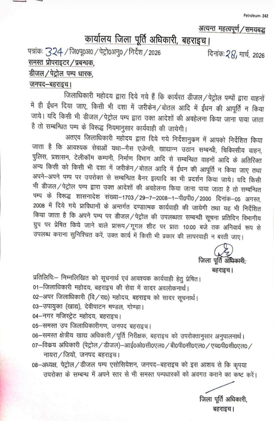 बहराइच जिलाधिकारी व डी एस ओ का निर्देश बोतल व जारीकेन मे पेट्रोल व डीजल देने पर पेट्रोल पंप के मालिक पर सख्त कार्यवाई