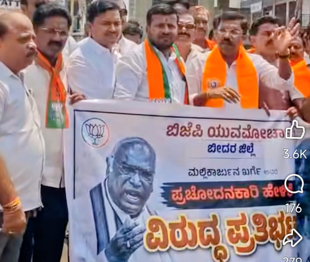 ಕಾಂಗ್ರೆಸ್ ಎಐಸಿಸಿ ಅಧ್ಯಕ್ಷ ಮಲ್ಲಿಕಾರ್ಜುನ ಖರ್ಗೆ ಇತ್ತೀಚೆಗೆ ಬಿಜೆಪಿ ಮತ್ತು ಆರ್ ಎಸ್ ಎಸ್ ಬಗ್ಗೆ ಪ್ರಚೋದನಕಾರಿ ಹೇಳಿಕೆ ನೀಡಿ ವಿವಾದವನ್ನು ಮೈ ಮೇಲೆ ಎಳೆದುಕೊಂಡ ಘಟನೆ ವಿರುದ್ಧ ಬೀದರ್ ಬಿಜೆಪಿ ಯುವ ಮೋರ್ಚಾ ಕಾರ್ಯಕರ್ತರಿಂದ ಪ್ರತಿಭಟನೆ ನಡೆದು ಖರ್ಗೆಯವರು ದೇಶದ ಅಭಿವೃದ್ಧಿ ಸಹಿಸದೆ ಈ ತರಹ ಹೇಳಿಕೆ ನೀಡುತ್ತಿರುವುದು ಖಂಡನೀಯಎಂದರು