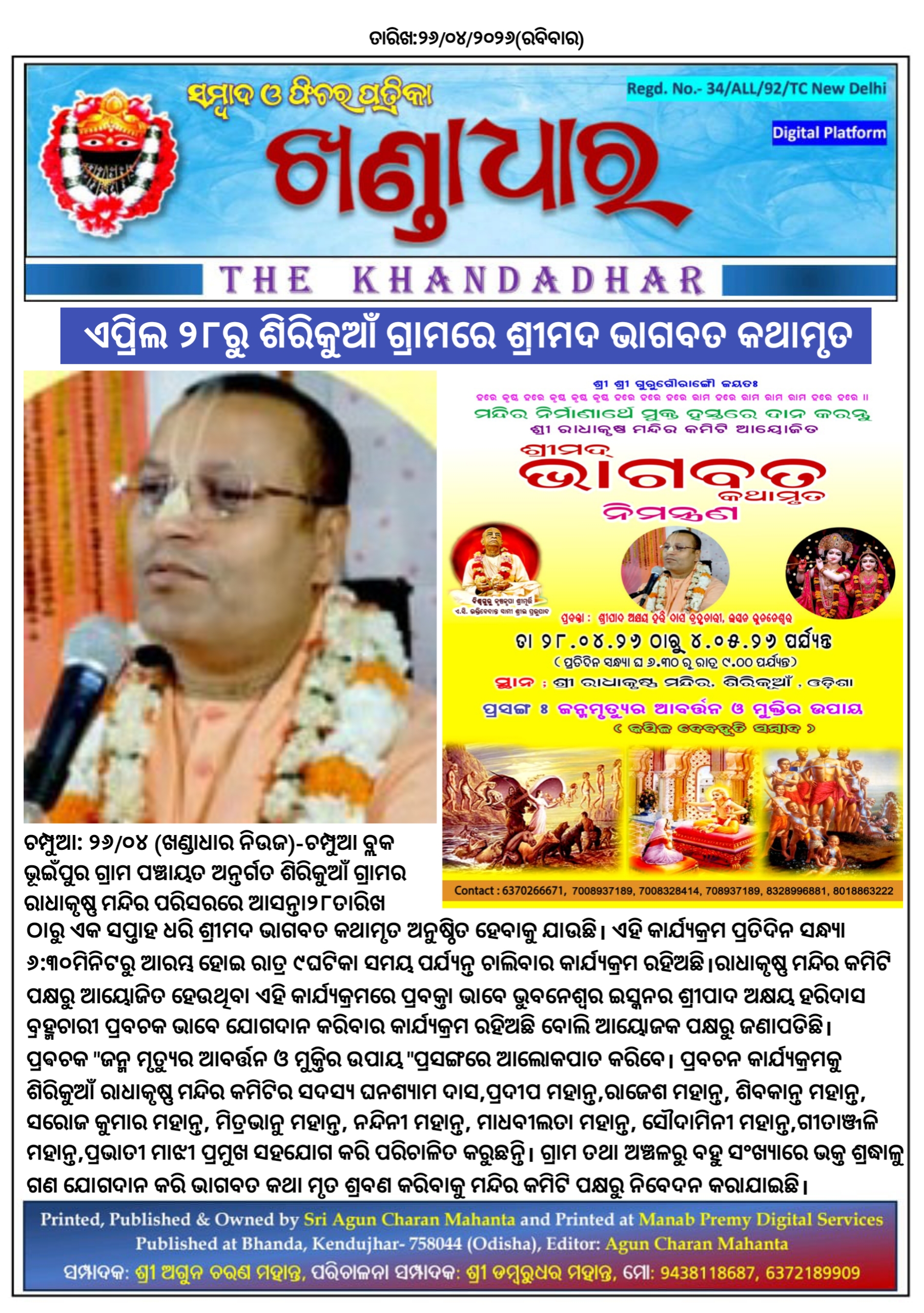 ଏପ୍ରିଲ ୨୮ରୁ ଶିରିକୁଆଁ ଗ୍ରାମରେ ଶ୍ରୀମଦ ଭାଗବତ କଥାମୃତ।