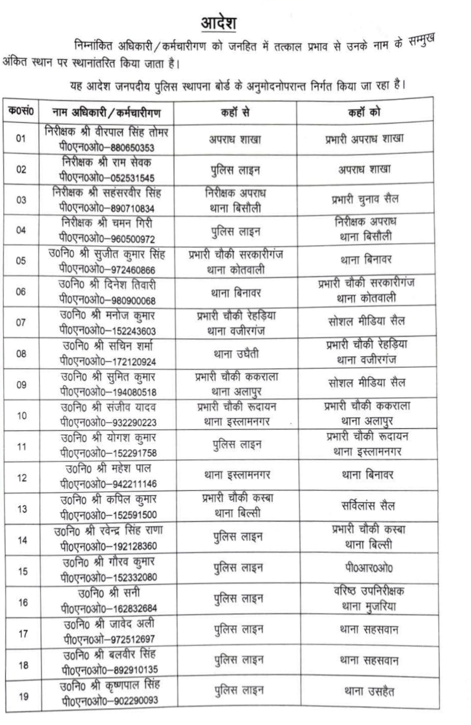 बदायूं। जनपद में कानून व्यवस्था को और अधिक सुदृढ़ बनाने के उद्देश्य से पुलिस अधीक्षक अंकिता शर्मा द्वारा पुलिस विभाग में व्यापक स्तर पर तबादले किए गए हैं। जारी आदेश के अनुसार कई निरीक्षक एवं उपनिरीक्षकों को तत्काल प्रभाव से नई तैनाती दी गई है। यह स्थानांतरण जनपदीय पुलिस स्थापना बोर्ड की संस्तुति के बाद किए गए हैं, जिनका मुख्य उद्देश्य कार्यक्षमता बढ़ाना एवं व्यवस्था को और बेहतर बनाना है। आदेश के तहत अपराध शाखा, थाना स्तर और विभिन्न चौकियों पर तैनात अधिकारियों को इधर से उधर किया गया है। सूची के अनुसार निरीक्षक स्तर से लेकर उपनिरीक्षक स्तर तक कुल 25 पुलिसकर्मियों के कार्यक्षेत्र में बदलाव किया गया है। कुछ अधिकारियों को अपराध शाखा, चुनाव सेल एवं सोशल मीडिया सेल जैसे महत्वपूर्ण विभागों में जिम्मेदारी सौंपी गई है, जबकि कई को थानों व चौकियों की कमान दी गई है।वशिष्ठ पुलिस अधीक्षक ने स्पष्ट किया है कि सभी स्थानांतरित अधिकारी अपने नए तैनाती स्थल पर तत्काल कार्यभार ग्रहण करें और कानून व्यवस्था को प्रभावी बनाए रखने में पूरी जिम्मेदारी के साथ कार्य करें। इस फेरबदल को पुलिस व्यवस्था में पारदर्शिता और सक्रियता बढ़ाने की दिशा में महत्वपूर्ण कदम माना जा रहा है। संवाद
