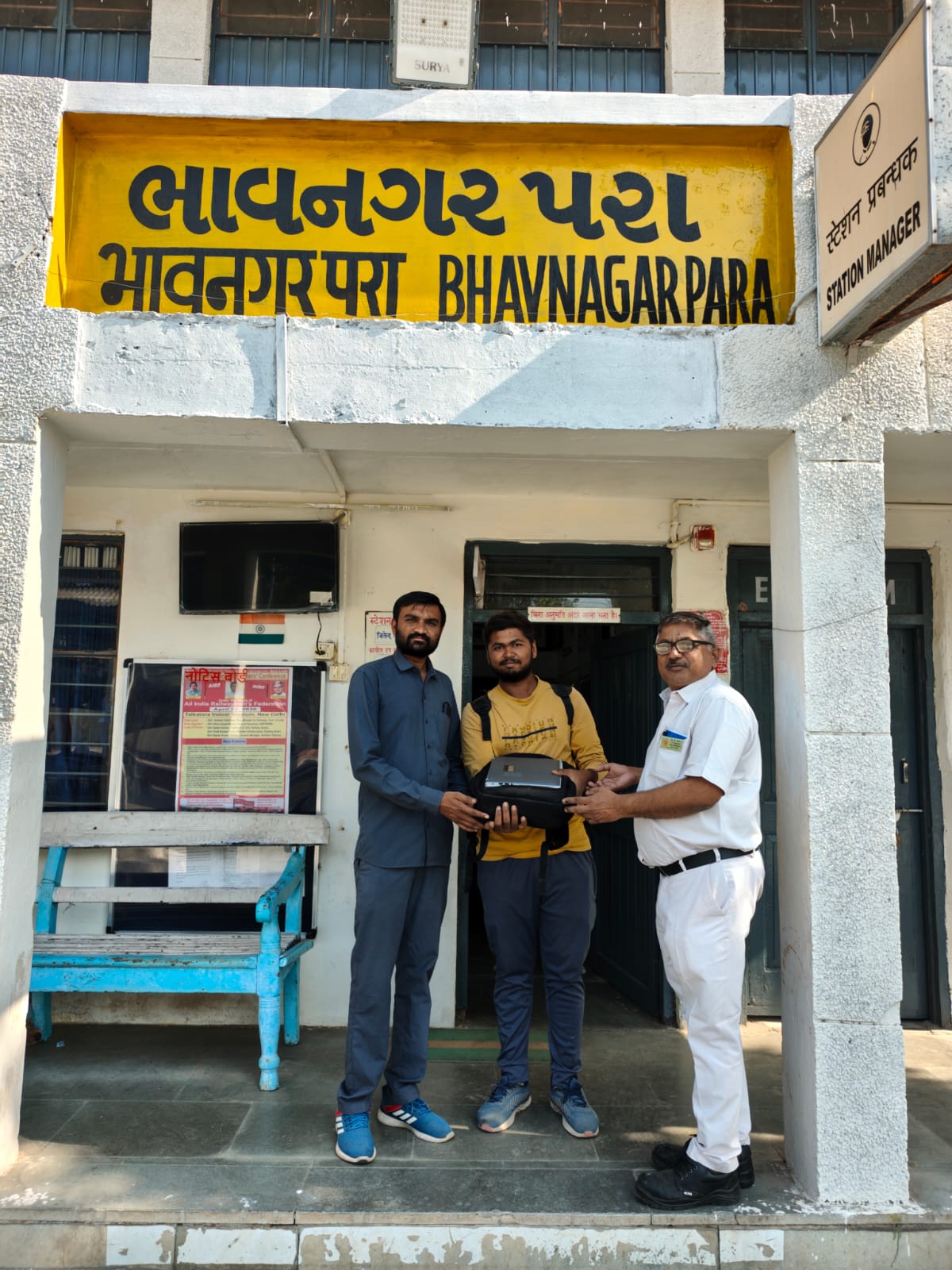 ट्रेन संख्या 59272 भावनगर–सुरेन्द्रनगर पैसेंजर से यात्रा कर रहे यात्री श्री गोविदा सठिया का लैपटॉप युक्त बैग प्लेटफॉर्म संख्या 1 पर छूट गया था।