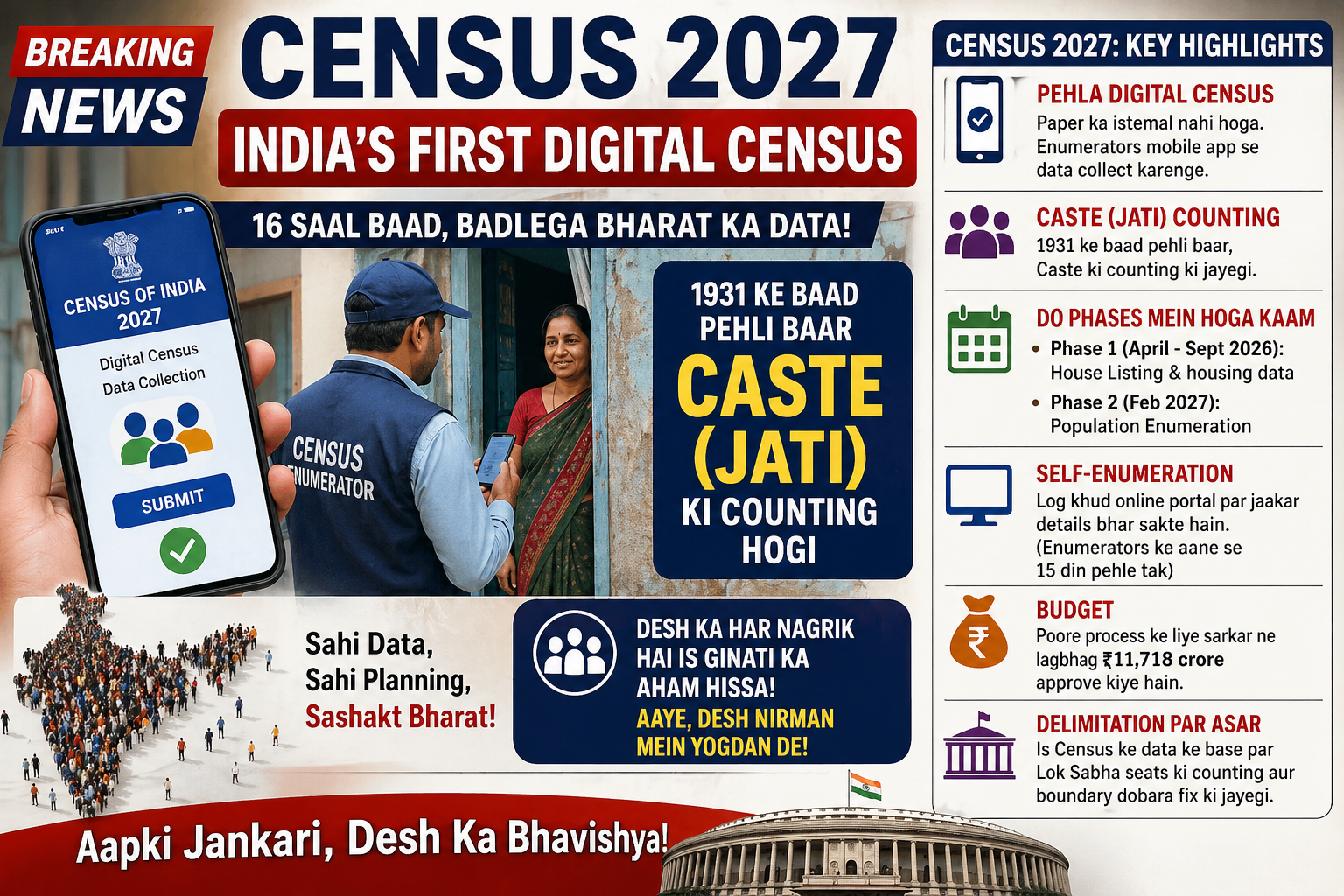 Sabse badi baat yeh hai ki is baar caste (jati) ki counting bhi ki jayegi, jo 1931 ke baad pehli baar ho raha hai. Census do phases mein hoga—pehla phase April se September 2026 tak house listing ke liye aur doosra phase February 2027 mein population counting ke liye.