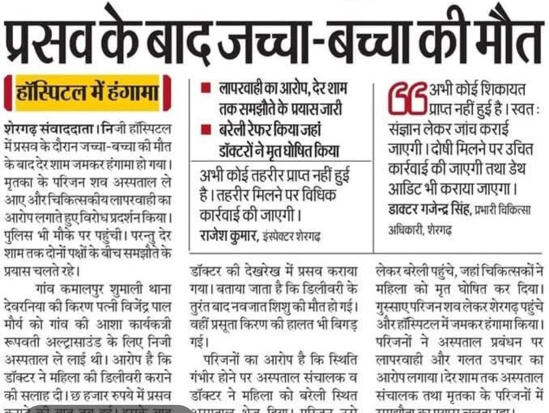 ​प्राप्त जानकारी के अनुसार, ग्राम कमालपुर निवासी किरण (पत्नी विजेंद्र पाल मौर्य) को प्रसव पीड़ा होने पर शेरगढ़ के एक निजी अस्पताल में भर्ती कराया गया था। परिजनों का आरोप है कि डॉक्टर की लापरवाही के कारण नवजात शिशु की मौके पर ही मौत हो गई। जब महिला की हालत बिगड़ने लगी, तो अस्पताल संचालक ने आनन-फानन में उसे बरेली रेफर कर दिया, जहाँ चिकित्सकों ने महिला को भी मृत घोषित कर दिया।