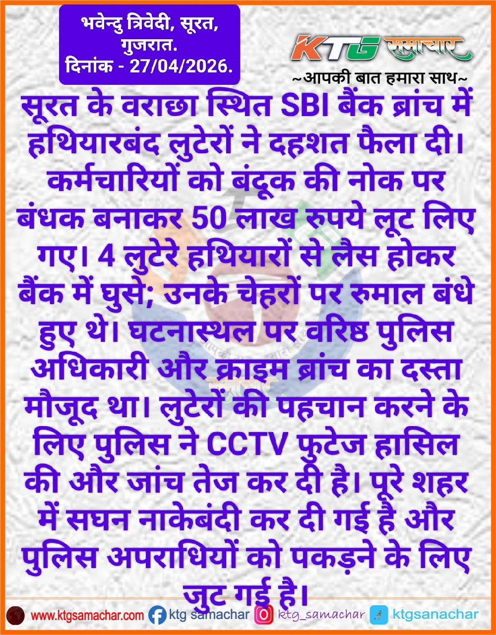 सूरत के वराछा स्थित एसबीआई बैंक ब्रांच में हथियारबंद लुटेरों ने दहशत फैला दी।