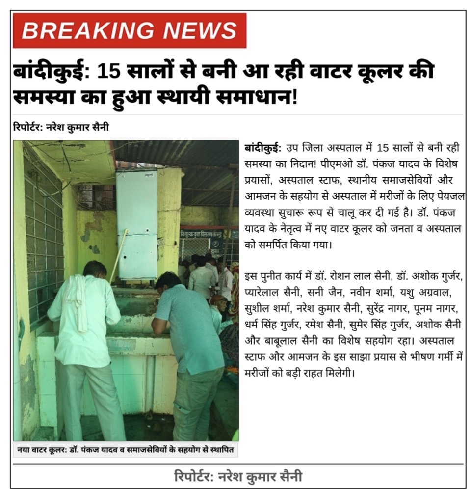 उपजिला अस्पताल बांदीकुई विगत15 साल वाटर कूलर की समस्या का हुआ निदान