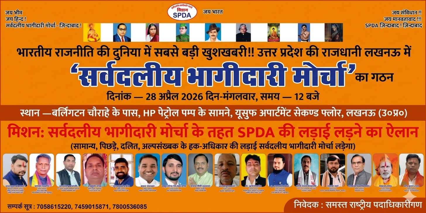 सर्वजनि भागीदारी मोर्चा अब सामान्य दलित पिछड़ा वर्ग अल्पसंख्यक की लड़ाई लड़ने जा रहा है जिसमें कई राष्ट्रीय पार्टियों जुड़ रही है इसमें राष्ट्रीय एकता समाज पार्टी आदर्शवादी भारतीय हिन्दू सनातन धर्म सेना की अगवानी में कार्यक्रम सुनिश्चित किया गया है जिसमें विश्व कल्याण राष्ट्रीय मानव समाज पार्टी मानव संघर्ष पार्टी जन सेवा पार्टी बहादुर आदमी पार्टी समस्त भाव फाउंडेशन जन सेवा दल आदि पार्टियों जुड़ रही है और इस मोर्चे पर पूरे उत्तर प्रदेश में चुनाव लड़ा जाएगा 13 राजनीतिक दल अब तक जुड़े हुए हैं जिनको जोड़ना है वह भी जुड़ सकते हैं इस मोर्चे में