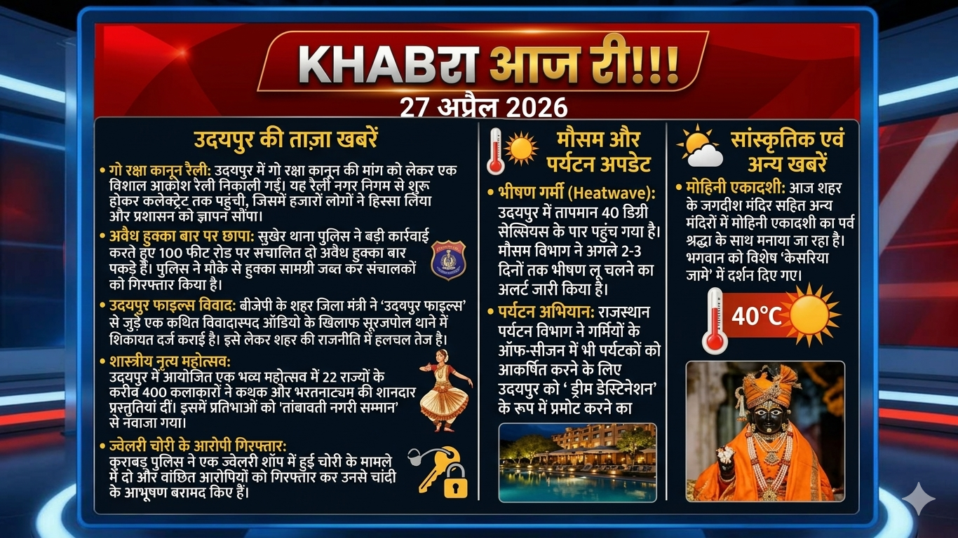 गो रक्षा कानून रैली: उदयपुर में गो रक्षा कानून की मांग को लेकर एक विशाल आक्रोश रैली निकाली गई। यह रैली नगर निगम से शुरू होकर कलेक्ट्रेट तक पहुंची, जिसमें हजारों लोगों ने हिस्सा लिया और प्रशासन को ज्ञापन सौंपा।