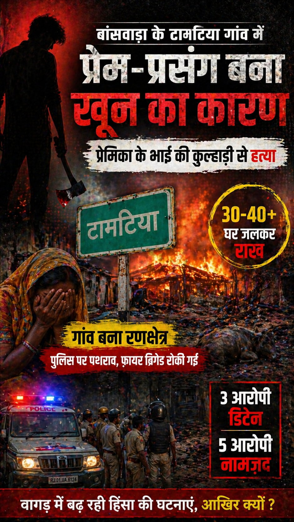 राजस्थान के बांसवाड़ा जिले से एक बेहद दर्दनाक और चिंताजनक खबर सामने आई है, जिसने पूरे वागड़ क्षेत्र को झकझोर कर रख दिया है। मोटागांव थाना क्षेत्र के टामटिया गांव में एक प्रेम-प्रसंग को लेकर हुए विवाद ने हिंसक रूप ले लिया, जिसके बाद न सिर्फ एक युवक की हत्या हुई बल्कि पूरे गांव में आगजनी और हिंसा फैल गई।