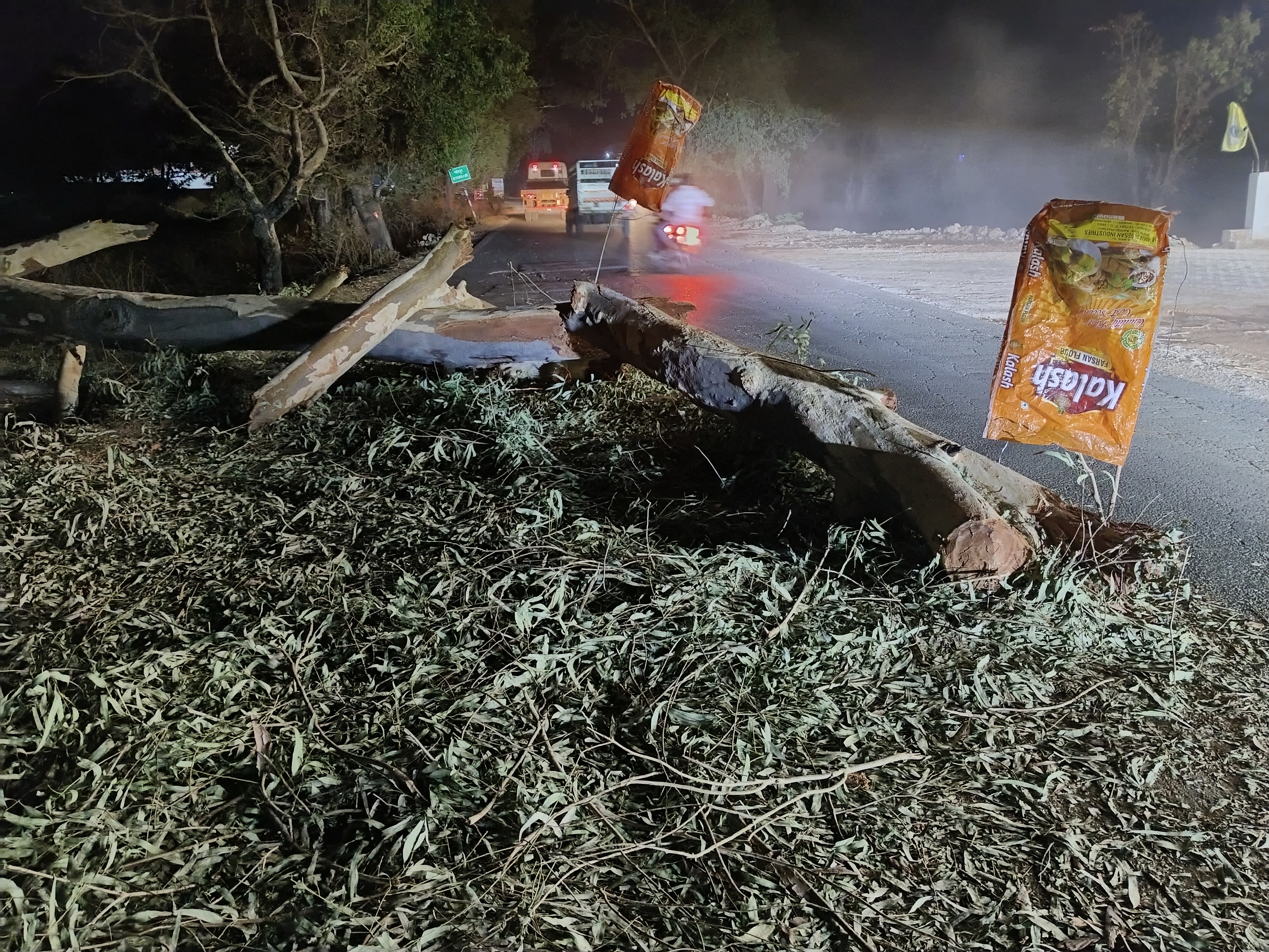 बीच सड़क पर गिरा यूकेलिप्टस का पेड़, विभाग मौन — राहगीर परेशान