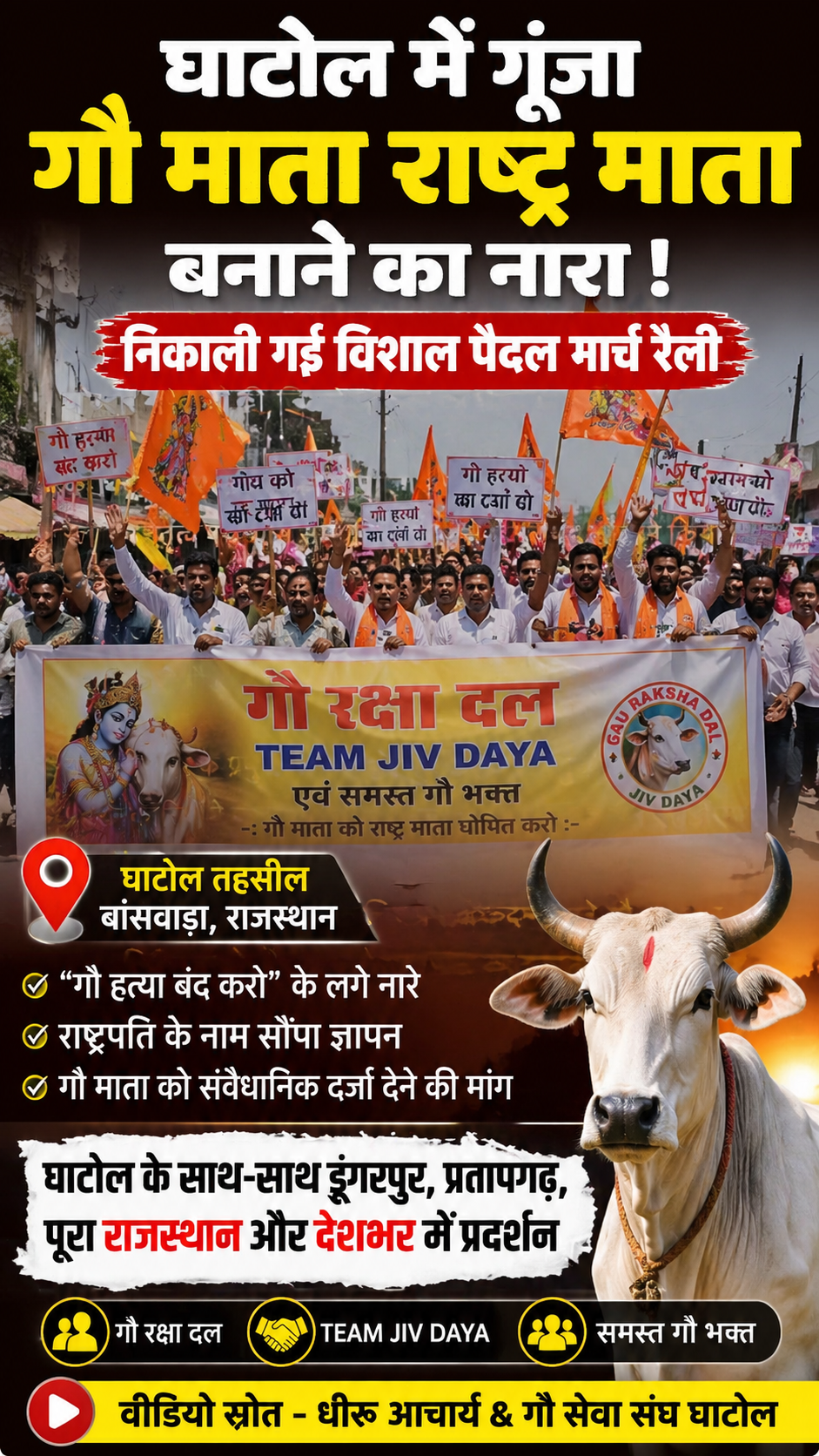 राजस्थान के बांसवाड़ा जिले की घाटोल तहसील से एक महत्वपूर्ण सामाजिक मुद्दे को लेकर खबर सामने आई है। सोमवार को क्षेत्र में गौ माता को राष्ट्र माता घोषित करने की मांग को लेकर एक पैदल मार्च निकाला गया, जिसमें बड़ी संख्या में लोगों ने भाग लिया।