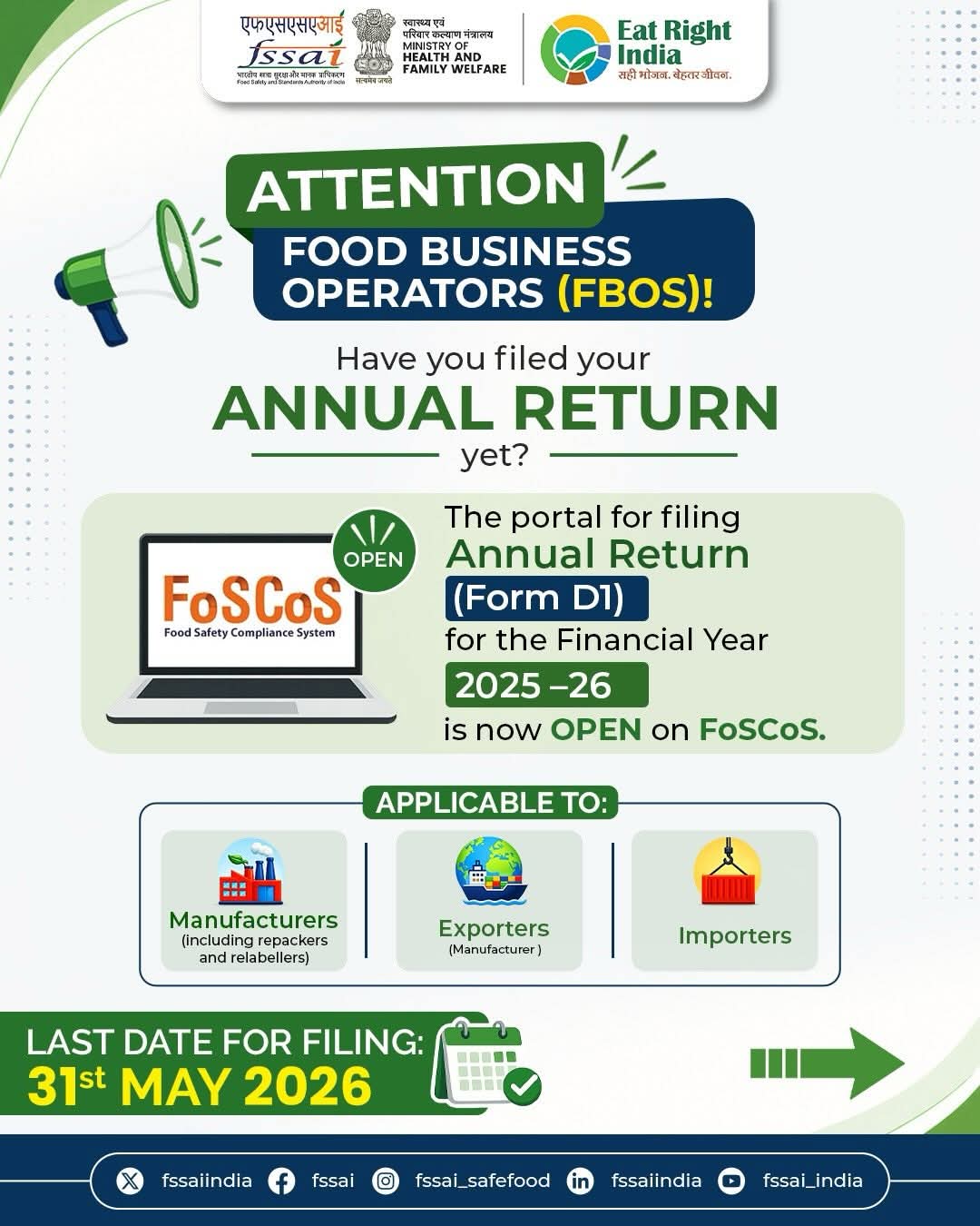 The FoSCoS portal is now open for filing Annual Return (Form D1) for FY 2025–26. Manufacturers (including repackers and relabellers), exporters, and importers must file their returns by 31st May 2026.