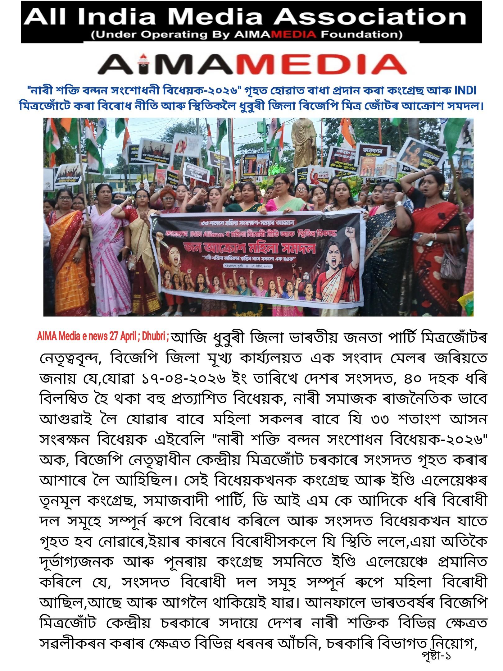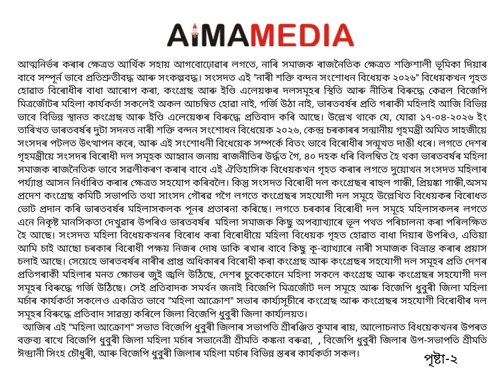 মহিলা আক্ৰোশ সমদল বিজেপি ধুবুৰী জিলা মহিলা মৰ্চাৰ উদ্যোগত