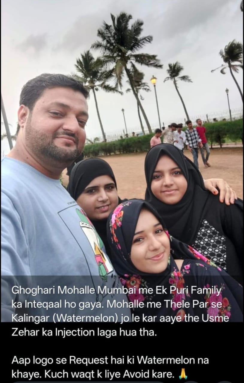 में एक ही परिवार के चार सदस्यों की मौत हो गई। आशंका है कि उन्होंने चिकन बिरयानी के बाद तरबूज (कलिंगड) खाया था, जिससे यह संदिग्ध फूड पॉइजनिंग का मामला बन गया। पुलिस मामले की जांच कर रही है और पोस्टमार्टम रिपोर्ट का इंतजार है।