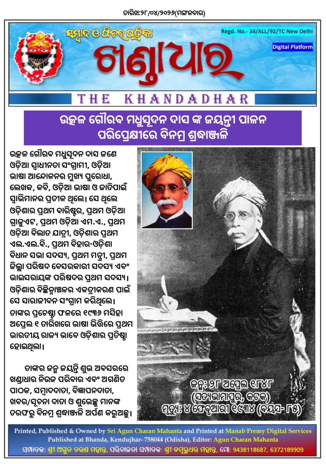 ଉତ୍କଳ ଗୌରବ ମଧୁସୂଦନ ଦାସ ଙ୍କ ଜୟନ୍ତୀ ପାଳନ ପରିପ୍ରେକ୍ଷୀରେ ବିନମ୍ର ଶ୍ରଦ୍ଧାଞ୍ଜଳି।
