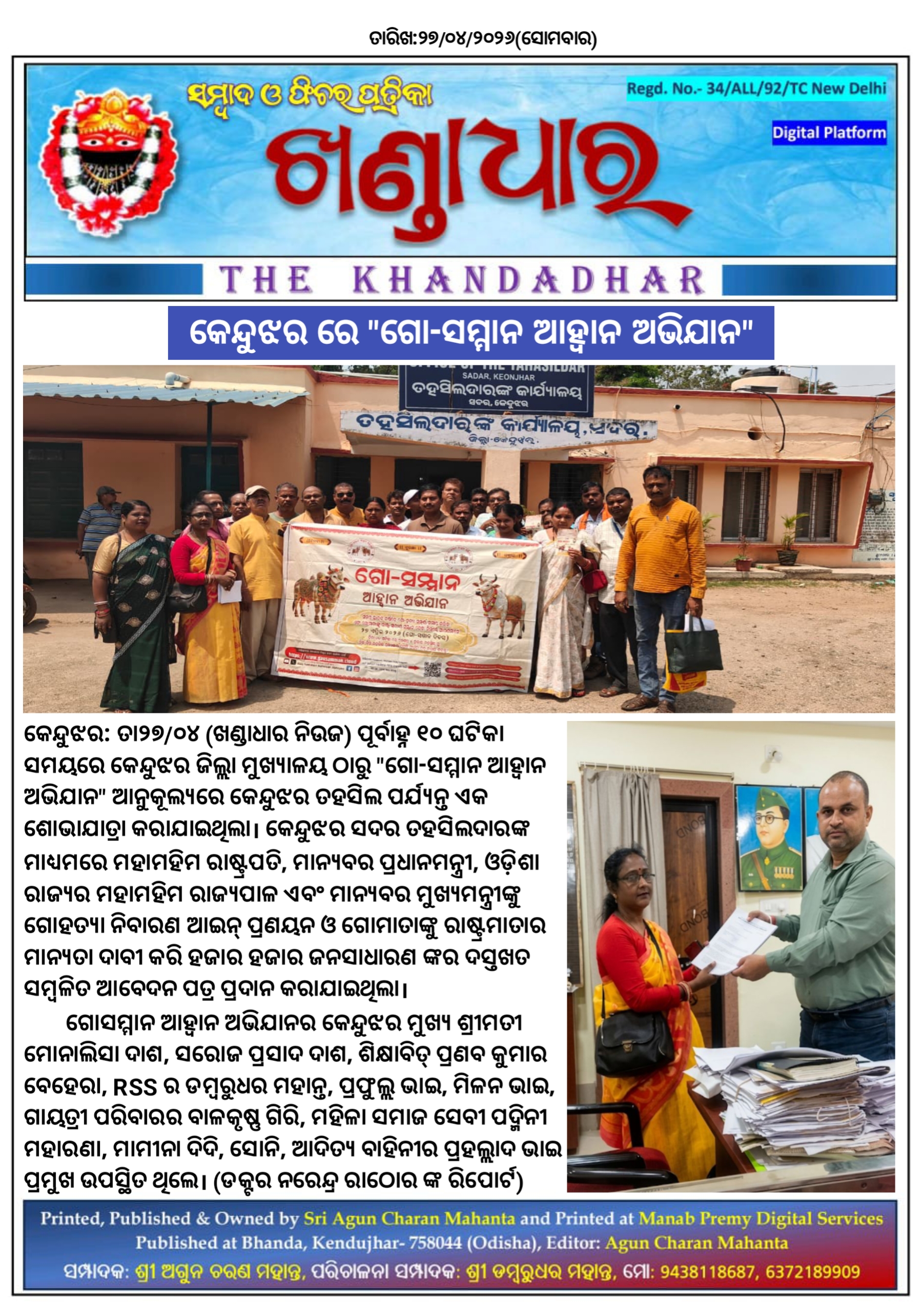 କେନ୍ଦୁଝର: ତା୨୭/୦୪ (ଖଣ୍ଡାଧାର ନିଉଜ) ପୂର୍ବାହ୍ନ ୧୦ ଘଟିକା ସମୟରେ କେନ୍ଦୁଝର ଜିଲ୍ଲା ମୁଖ୍ୟାଳୟ ଠାରୁ "ଗୋ-ସମ୍ମାନ ଆହ୍ୱାନ ଅଭିଯାନ" ଆନୁକୂଲ୍ୟରେ କେନ୍ଦୁଝର ତହସିଲ ପର୍ଯ୍ୟନ୍ତ ଏକ ଶୋଭାଯାତ୍ରା କରାଯାଇଥିଲା। କେନ୍ଦୁଝର ସଦର ତହସିଲଦାରଙ୍କ ମାଧ୍ୟମରେ ମହାମହିମ ରାଷ୍ଟ୍ରପତି, ମାନ୍ୟବର ପ୍ରଧାନମନ୍ତ୍ରୀ, ଓଡ଼ିଶା ରାଜ୍ଯର ମହାମହିମ ରାଜ୍ୟପାଳ ଏବଂ ମାନ୍ୟବର ମୁଖ୍ୟମନ୍ତ୍ରୀଙ୍କୁ ଗୋହତ୍ୟା ନିବାରଣ ଆଇନ୍ ପ୍ରଣୟନ ଓ ଗୋମାତାଙ୍କୁ ରାଷ୍ଟ୍ରମାତାର ମାନ୍ୟତା ଦାବୀ କରି ହଜାର ହଜାର ଜନସାଧାରଣ ଙ୍କର ଦସ୍ତଖତ ସମ୍ବଳିତ ଆବେଦନ ପତ୍ର ପ୍ରଦାନ କରାଯାଇଥିଲା।