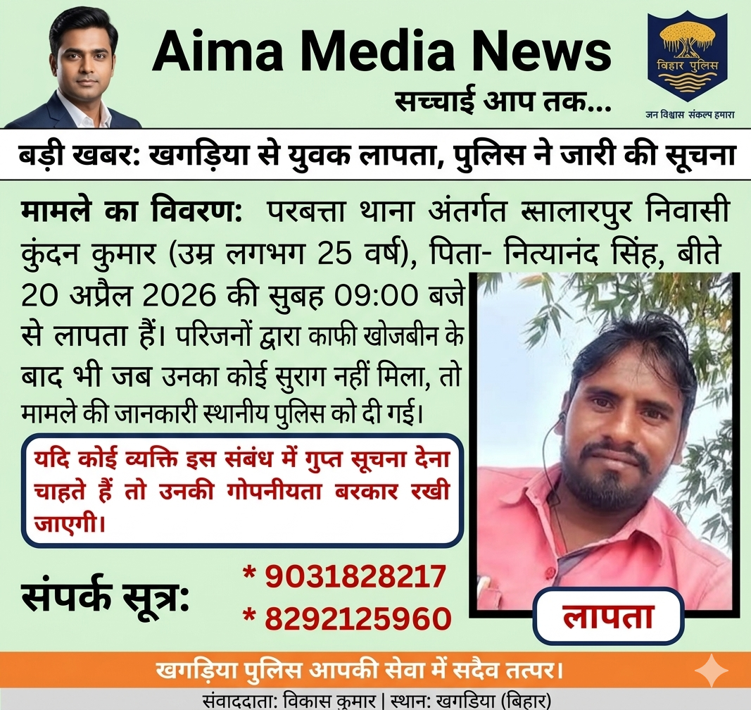 ## **Aima Media News** **सच्चाई आप तक...** ### **बड़ी खबर: खगड़िया से युवक लापता, पुलिस