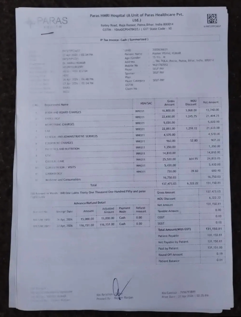 पटना, बिहार: राजधानी पटना के राजा बाजार स्थित Paras HMRI Hospital में 15 वर्षीय छात्र की मौत के बाद सोमवार को परिजनों ने जमकर हंगामा किया। गुस्साए लोगों ने अस्पताल परिसर में तोड़फोड़ की और ICU बेड व वेंटिलेटर तक सड़क पर निकालकर विरोध प्रदर्शन किया।