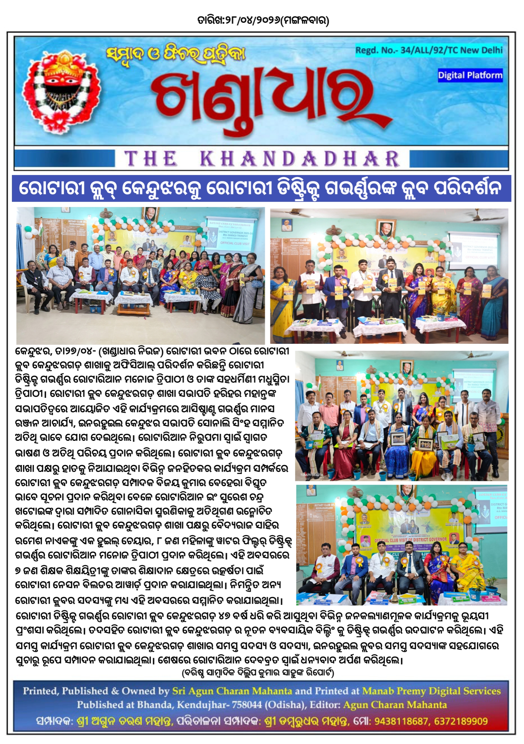 ରୋଟାରୀ କ୍ଲବ୍ କେନ୍ଦୁଝରକୁ ରୋଟାରୀ ଡିଷ୍ଟ୍ରିକ୍ଟ ଗଭର୍ଣ୍ଣରଙ୍କ କ୍ଲବ ପରିଦର୍ଶନ।