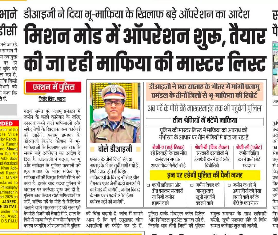 गढ़वा/पलामू: पलामू प्रमंडल के डीआईजी (DIG) किशोर कौशल ने भू-माफियाओं और जमीन के काले कारोबार में संलिप्त सफेदपोशों के खिलाफ अब तक के सबसे बड़े ऑपरेशन का आदेश दिया है। इस अभियान के तहत गढ़वा, पलामू और लातेहार जिलों के पुलिस कप्तानों को एक सप्ताह के भीतर सक्रिय भू-माफियाओं की विस्तृत रिपोर्ट सौंपने के निर्देश दिए गए हैं।