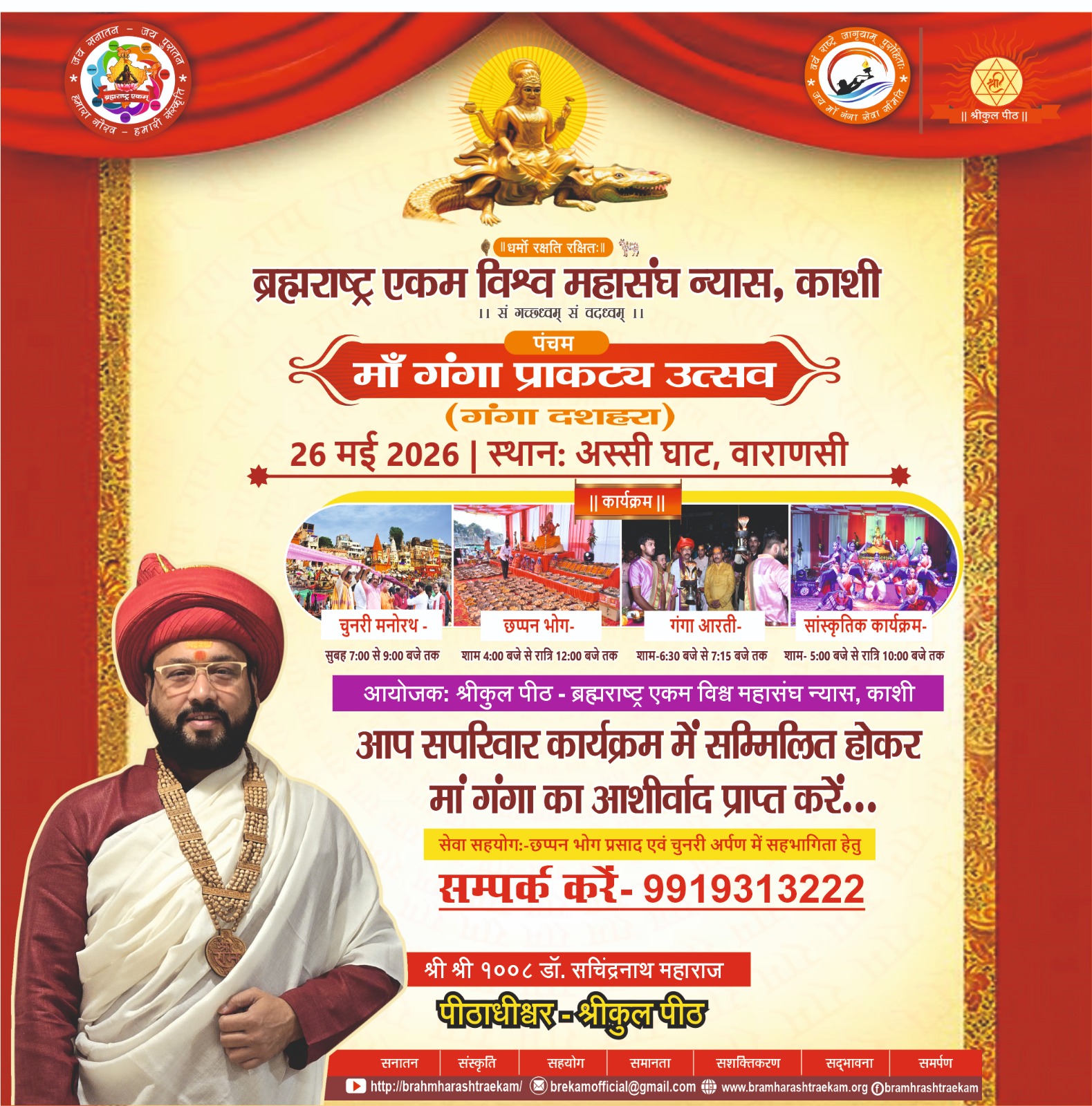 वाराणसी से बड़ी खबर: पावन नगरी वाराणसी के अस्सी घाट पर 26 मई 2026 को माँ गंगा प्राकट्य उत्सव (गंगा दशहरा) का भव्य आयोजन होने जा रहा है।