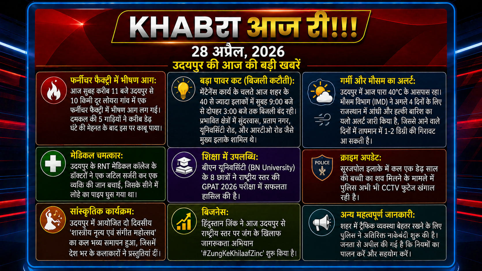 बड़ा पावर कट (बिजली कटौती): मेंटेनेंस कार्य के चलते आज शहर के 40 से ज्यादा इलाकों में सुबह 9:00 बजे से दोपहर 3:00 बजे तक बिजली बंद रही। प्रभावित क्षेत्रों में सुंदरवास, प्रताप नगर, यूनिवर्सिटी रोड, और आरटीओ रोड जैसे मुख्य इलाके शामिल थे।