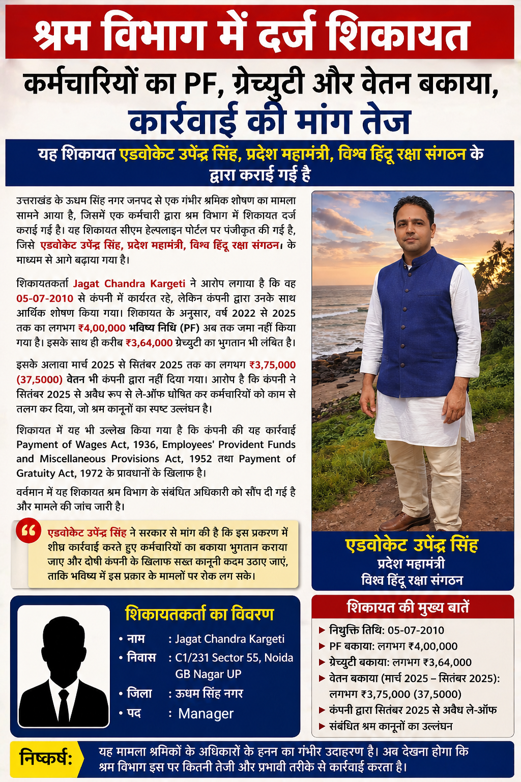 उत्तराखंड के उधम सिंह नगर जनपद से एक गंभीर श्रमिक शोषण का मामला सामने आया है, जिसमें एक कर्मचारी द्वारा श्रम विभाग में शिकायत दर्ज कराई गई है। यह शिकायत सीएम हेल्पलाइन पोर्टल पर पंजीकृत की गई है, जिसे एडवोकेट उपेंद्र सिंह, प्रदेश महामंत्री, विश्व हिंदू रक्षा संगठन के माध्यम से आगे बढ़ाया गया है।