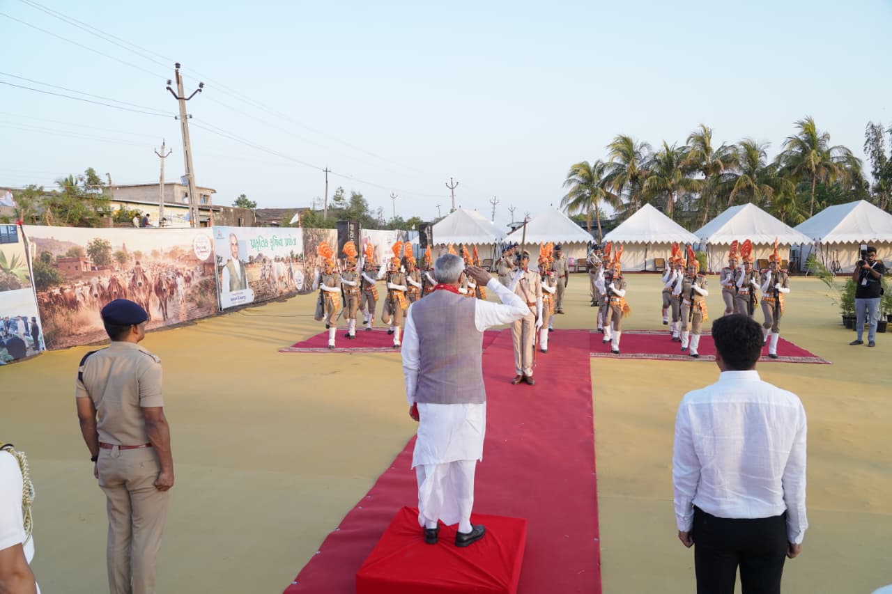 રાજ્યપાલશ્રી ખાંભા તાલુકાના ત્રાકુડા મુકામે શિવ મંદિર મૂર્તિ પ્રાણપ્રતિષ્ઠા મહોત્સવ ઉપરાંત ‘પ્રાકૃતિક કૃષિ સંવાદ સંમેલન’માં સહભાગી થવા માટે આવી પહોંચતા 'ગાર્ડ ઓફ ઓનર' સાથે તેમનું સ્વાગત-સન્માન કરવામાં આવ્યું હતું.