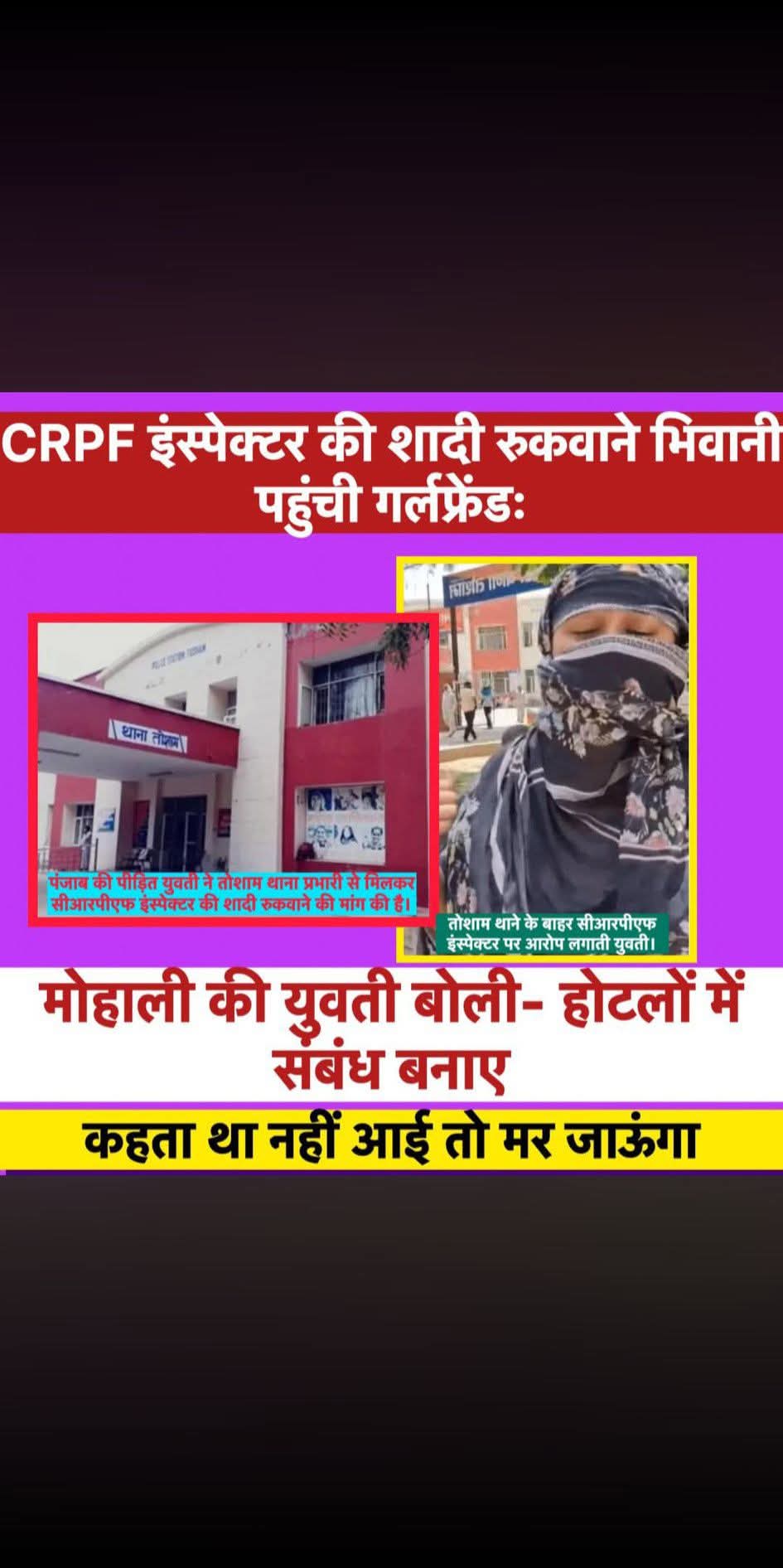 पंजाब के मोहाली की रहने वाली एक युवती ने हरियाणा के भिवानी जिले के एक CRPF इंस्पे*क्टर पर शादी का झांसा देकर शारीरिक संबंध बनाने (रेप) का आरो*प लगाया