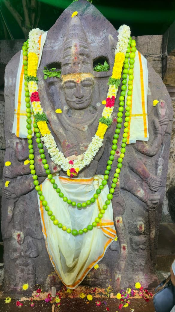ప్రసన్నవదనంతో కిరీట మకుటాన్ని కలిగి దశభుజుడైన స్వామివారు పది చేతులలో వివిధ ఆయుధాలతో దర్శనమిస్తాడు.స్వామివారికి క్రిందివైపున కుడివైపు దక్షుడు, ఎడమవైపు భద్రకాళి