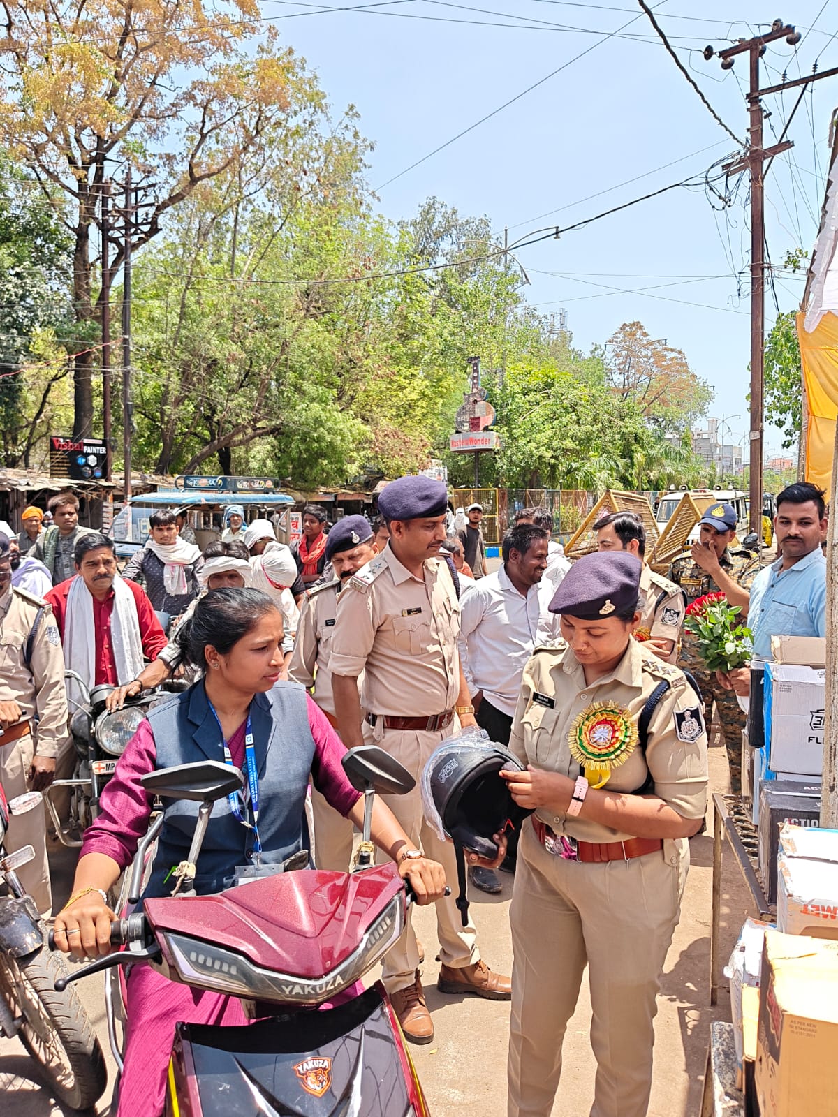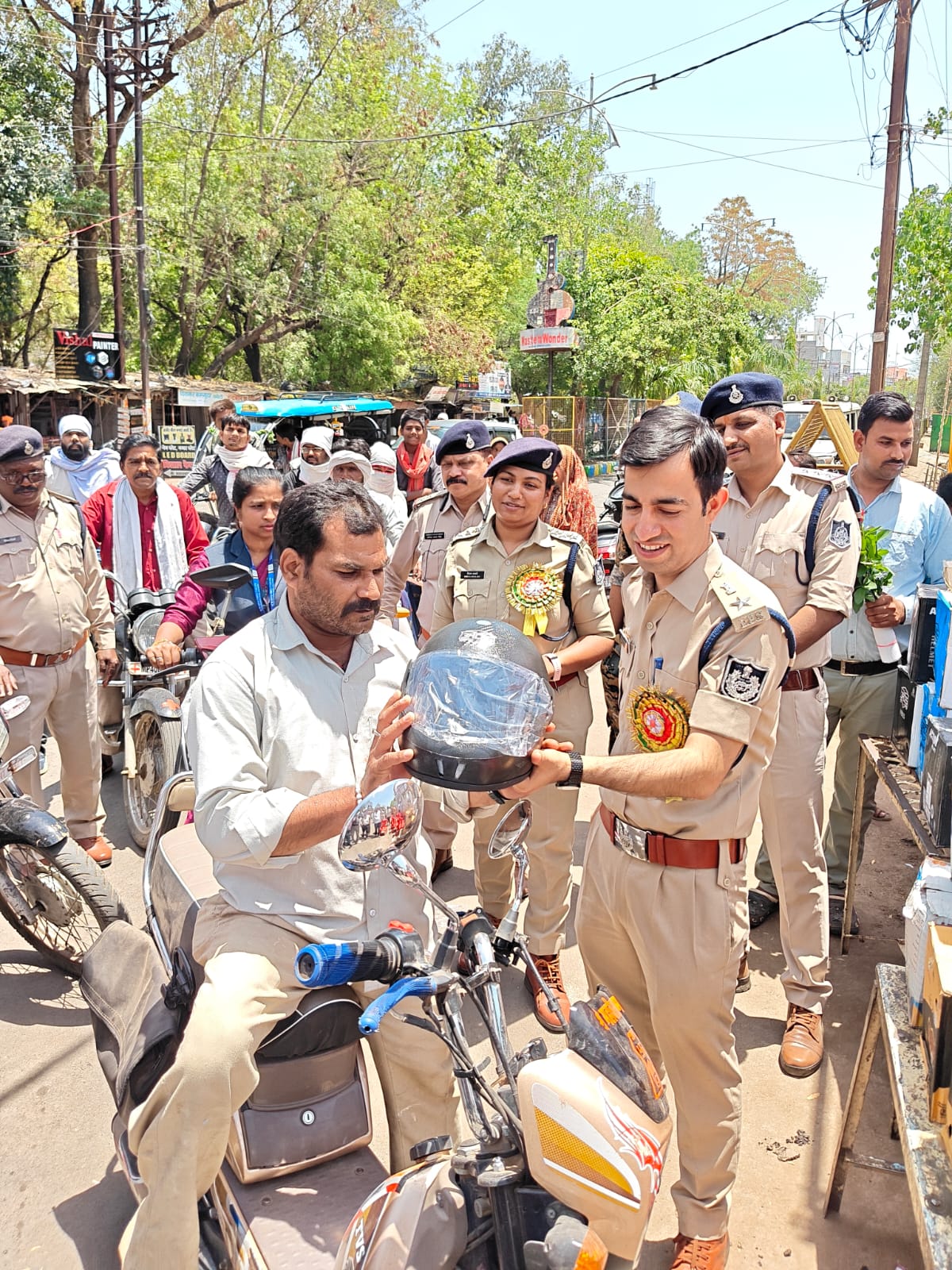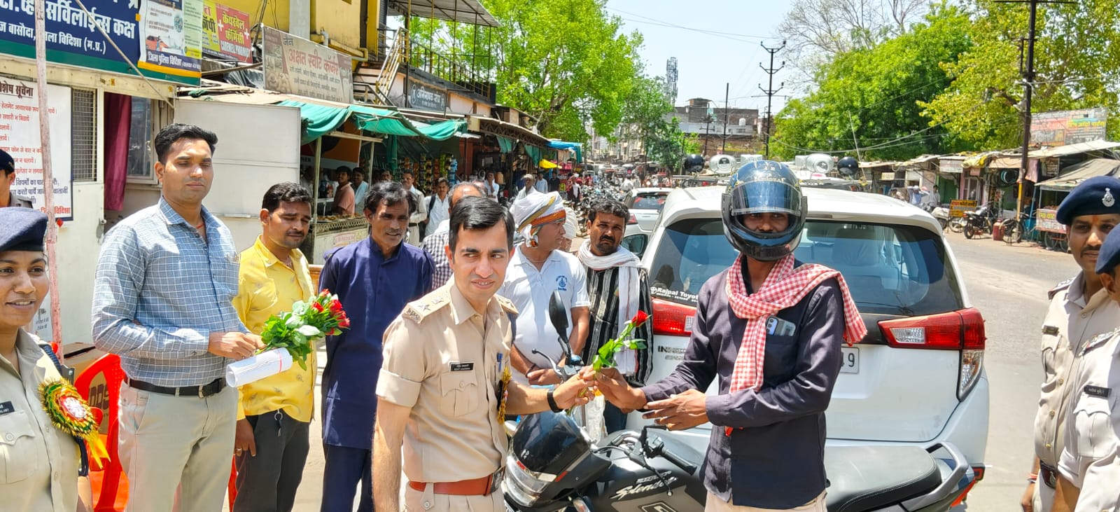 इसी क्रम में आज दिनांक 30 अप्रैल 2026 को पुलिस अधीक्षक विदिशा श्री रोहित काशवानी द्वारा जयस्तंभ चौराहे, गंजबासौदा क्षेत्र में ट्रैफिक जागरूकता अभियान चलाया गया। इस दौरान दोपहिया चालकों को हेलमेट वितरित किए गए एवं हेलमेट पहनकर वाहन चलाने वाले जागरूक नागरिकों को गुलाब का फूल देकर सम्मानित करते हुए उनका उत्साहवर्धन किया गया।