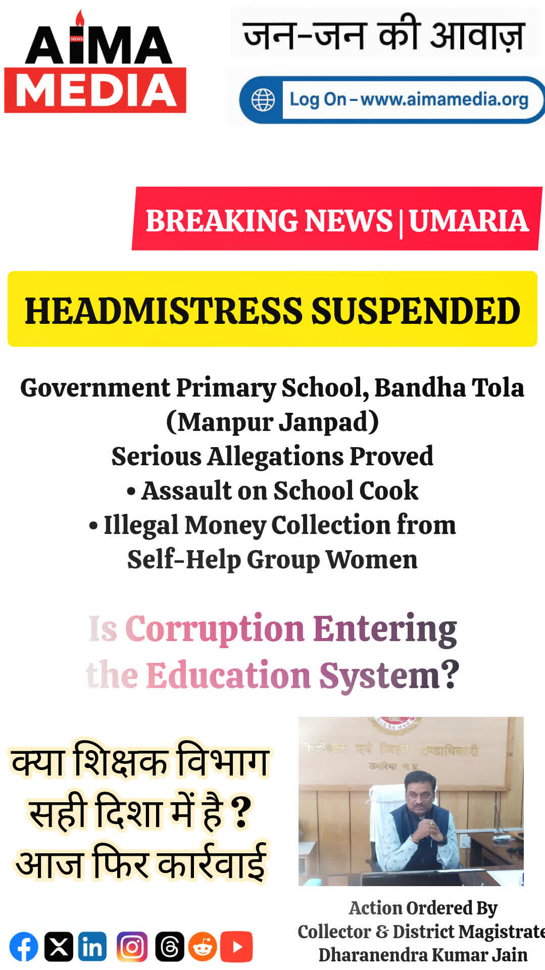 Abhilash Kumar Patha... Umaria, Madhya Pradesh (MP) AIMAMEDIA 11/01/2026 08:16 PM Report खेलों से निखरता बचपन: RSIT स्कूल में खेल महोत्सव संपन्न , Celebrating Sports & Spirit.... read more 1538 0 comment Abhilash Kumar Patha... Umaria, Madhya Pradesh (MP) AIMAMEDIA 10/01/2026 05:37 AM Report उपमुख्यमंत्री, राजेंद्र शुल्क का आज उमरिया आगमन आज करेंगे जिला स्वास्थ्य विभाग का निरीक्षण, विभिन्न मुद्दों पर.... read more 1083 0 comment Abhilash Kumar Patha... Umaria, Madhya Pradesh (MP) AIMAMEDIA 08/01/2026 06:06 PM Report शिक्षक विभाग को आज फिर शर्मसार होना पड़ा Teacher Department Once Again Under Question ? .... read more 1 1 1728 0 comment Abhilash Kumar Patha... Umaria, Madhya Pradesh (MP) AIMAMEDIA 12/12/2025 10:59 AM Report शिक्षा का मंदिर क्या इतना अपवित्र हो सकता है?” शासकीय विद्यालय मानपुर ब्लाक .... read more 11650 0 comment