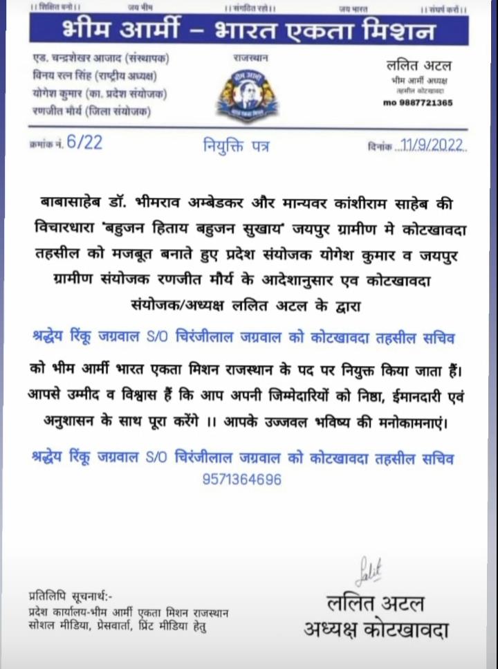 भीम आर्मी राजस्थान के जयपुर ग्रामीण जिला की चाकसू विधानसभा की कोटखावदा तहसील की कार्यकारिणी का विस्तार करते हुए तहसील संयोजक अध्यक्ष ललित अटल के द्वारा श्री देव रिंकू जगरवाल को कोटखावदा तहसील सचिव पद पर नियुक्त किए जाने पर हार्दिक बधाई एवं ढेर सारी शुभकामनाएं