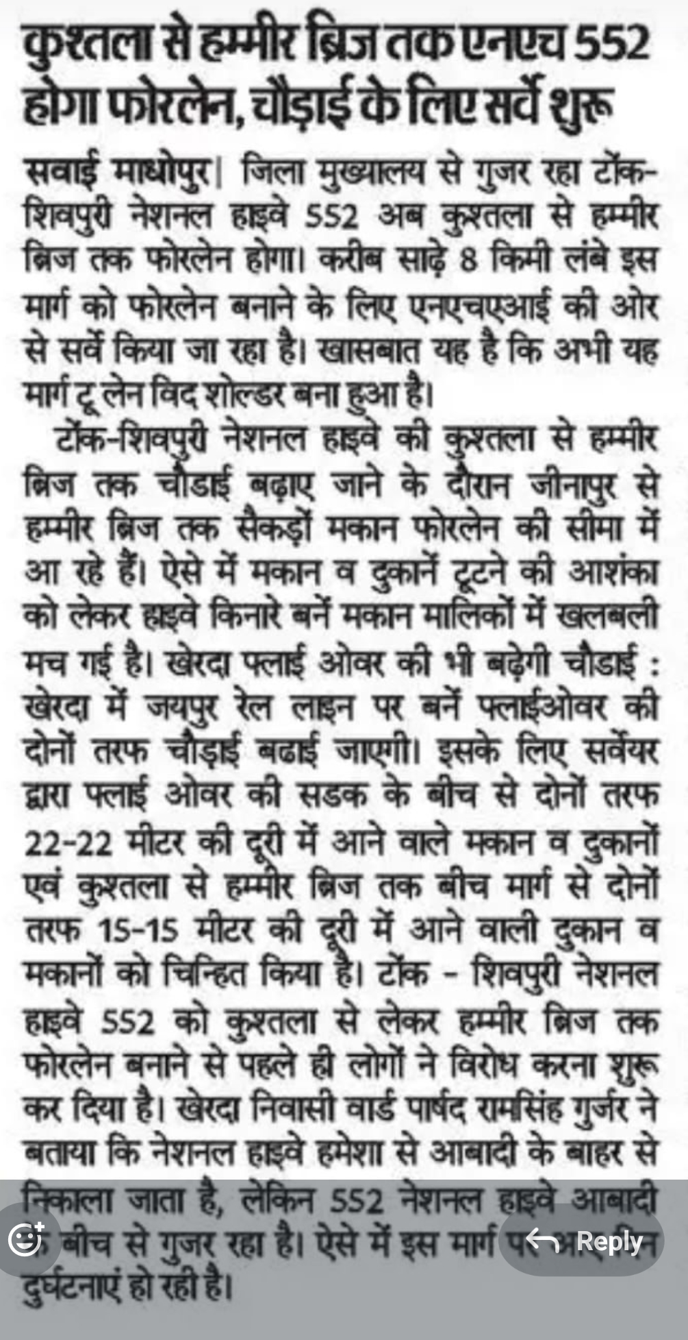 सवाई माधोपुर में सर्वे पूरा हुआ। टोंक शिवपुरी नेशनल हाईवे कुशतला से हमीर ब्रिज तक की चौड़ाई बढ़ाने के कारण सैकड़ों मकानों को भारी नुक्सान होगा जिससे मकान मालिक हुए परेशान।