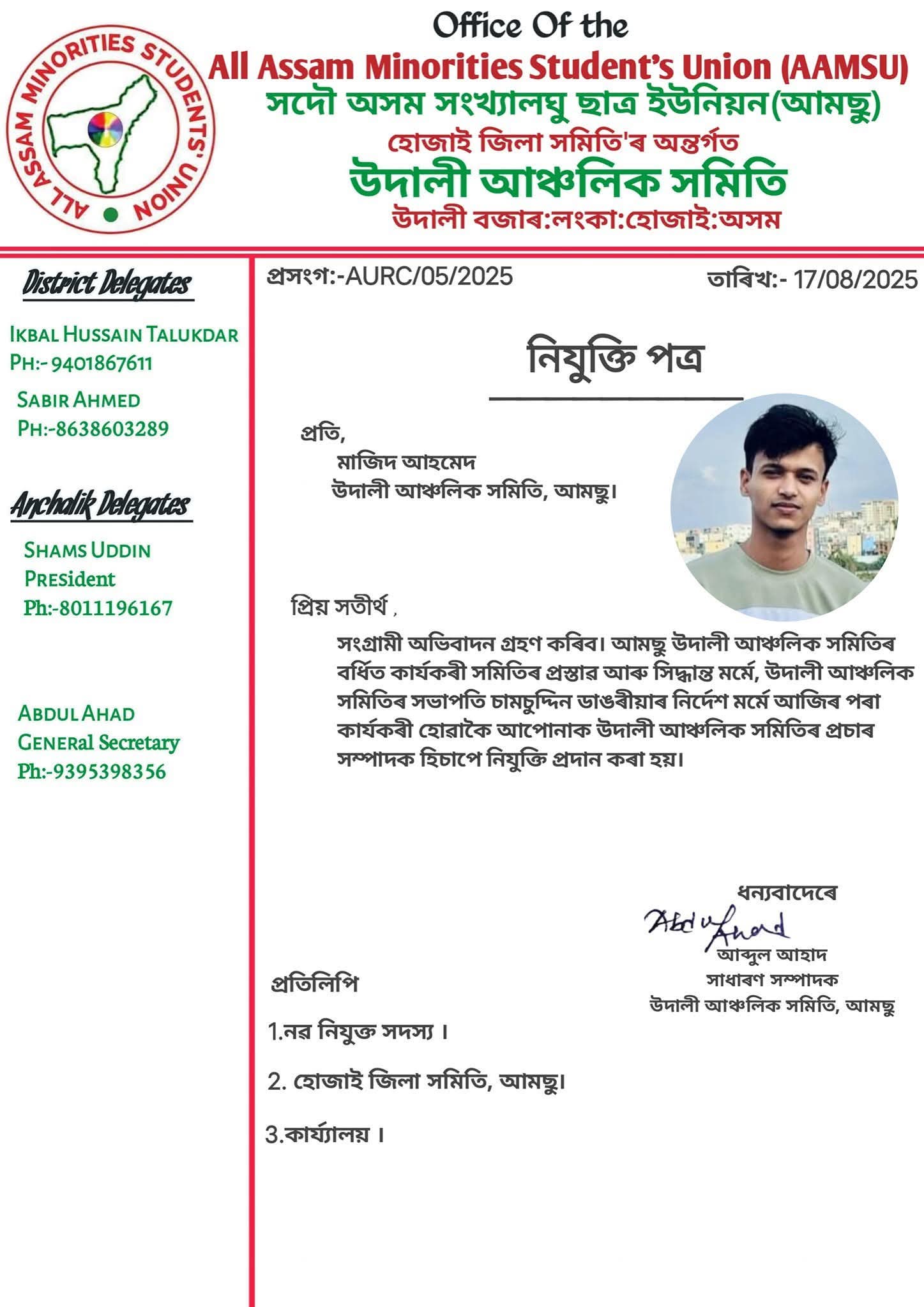 উদালী আঞ্চলিক সমিতিৰ মাজিদ আহমেদ'ক আজিৰ পৰা কাৰ্যকৰী হোৱাকৈ উদালী আঞ্চলিক সমিতিৰ প্ৰচাৰ সম্পাদক হিচাপে নিযুক্তি প্ৰদান কৰা হয়।