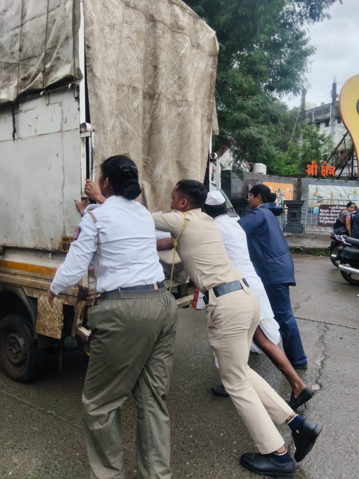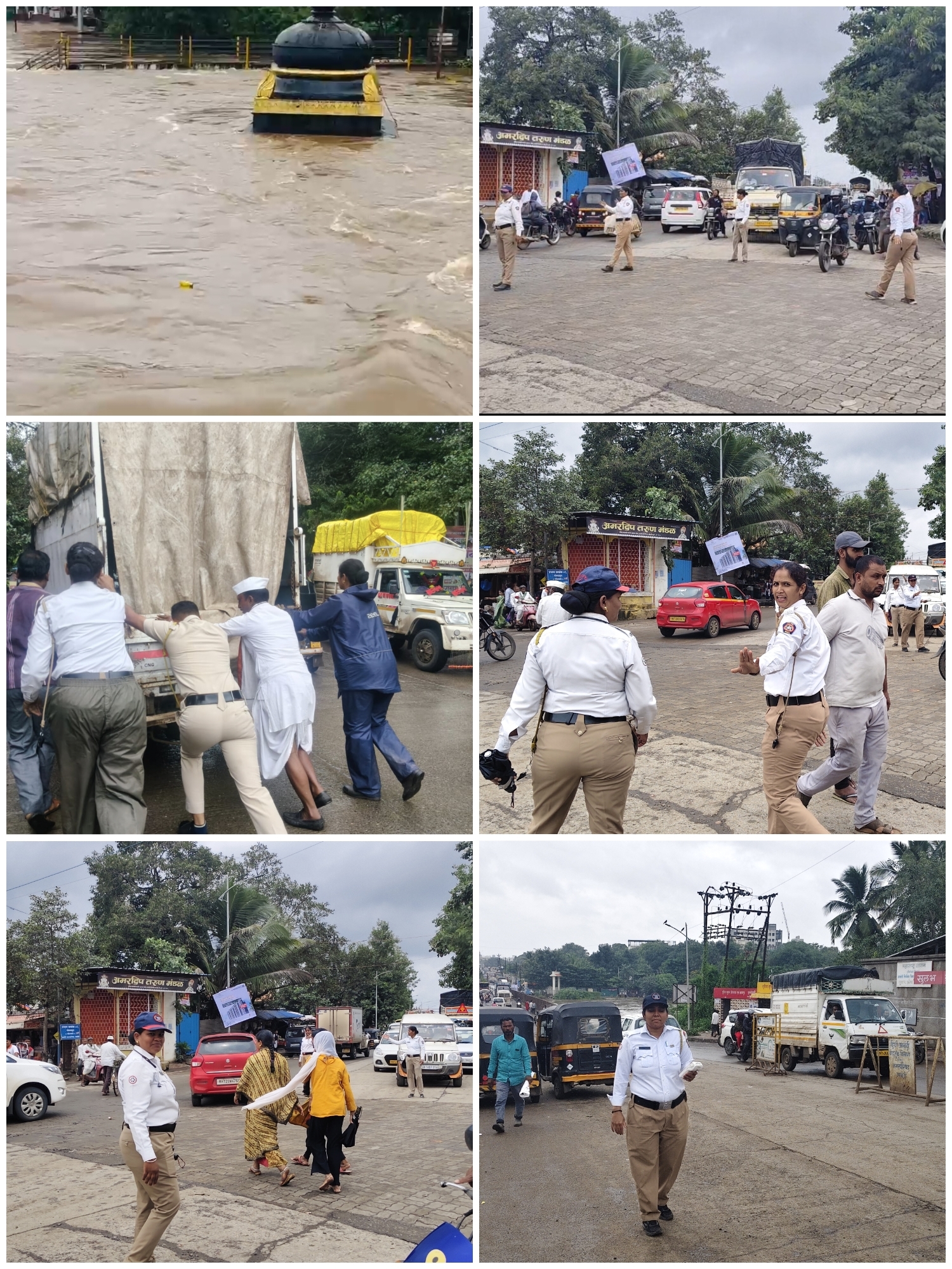 त्याचप्रमाणे शनी मंदिरातील परिसरातील दुकाने यांना सूचना देऊन बंद करण्यात आलेले आहेत,मावळात अतिवृष्टी झाल्यामुळे इंद्रायणी नदीला पूर आलेला आहे त्याचप्रमाणे आळंदी येथील जुना पूल रहदारीसाठी बंद करण्यात आलेले आहे, चाकण चौकात एक वाहन बंद पडल्यामुळे ट्रॅफिक झाली होती याची तत्परता राखून चाकण चौकात तैनात असलेले पोलीस व महिला पोलीस अपर्णा तापकीर, संगीता भाकरे,लांडगे, रोहिणी, लांडे, वंदना गव्हाणे,नर्मदा मिलखे,यांनी बंद पडलेले वाहन ढकलून ट्राफिक पूर्ववत केले त्यांचे सगळीकडेच कौतुक होत आहे, इंद्रायणी नदीला पूर आल्यामुळे नागरिकांनी नदीच्या पात्रात उतरू नये तसेच इंद्रायणी नदीच्या परिसरातील नागरिकांनी सतर्क रहावे,व प्रशासनाला सहकार्य करावे असे आवाहन आळंदी नगर परिषदेच्या वतीने देण्यात आला आहे
