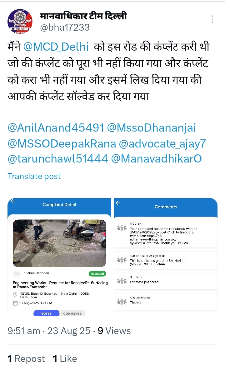 सुल्तानपुरी D ब्लॉक में एक MCD का एक विचित्र मामला देखने में आया है। यहां के निवासी कृष्ण जी द्वारा MCD311 पर एक कंप्लेंट डाली गई जिसको MCD ने बिना रिजॉल्व करे ही इसको रिजॉल्व दिखा दिया कृष्ण जी का कहना है कि MCD यहां अपनी मन मानी से कार्य करती है,और इनसे कुछ कहो तो ये लोग मार पीट पर उतारू हो जाते है। वास्तव में क्या ये उचित है क्या बीजेपी सरकार में ऐसा ही कार्य होगा कृष्ण जी एक समाज सेवक व्यक्ति है वे लोगों की भलाई के लिए जाने कितने ही समाज कार्य करवाते है।