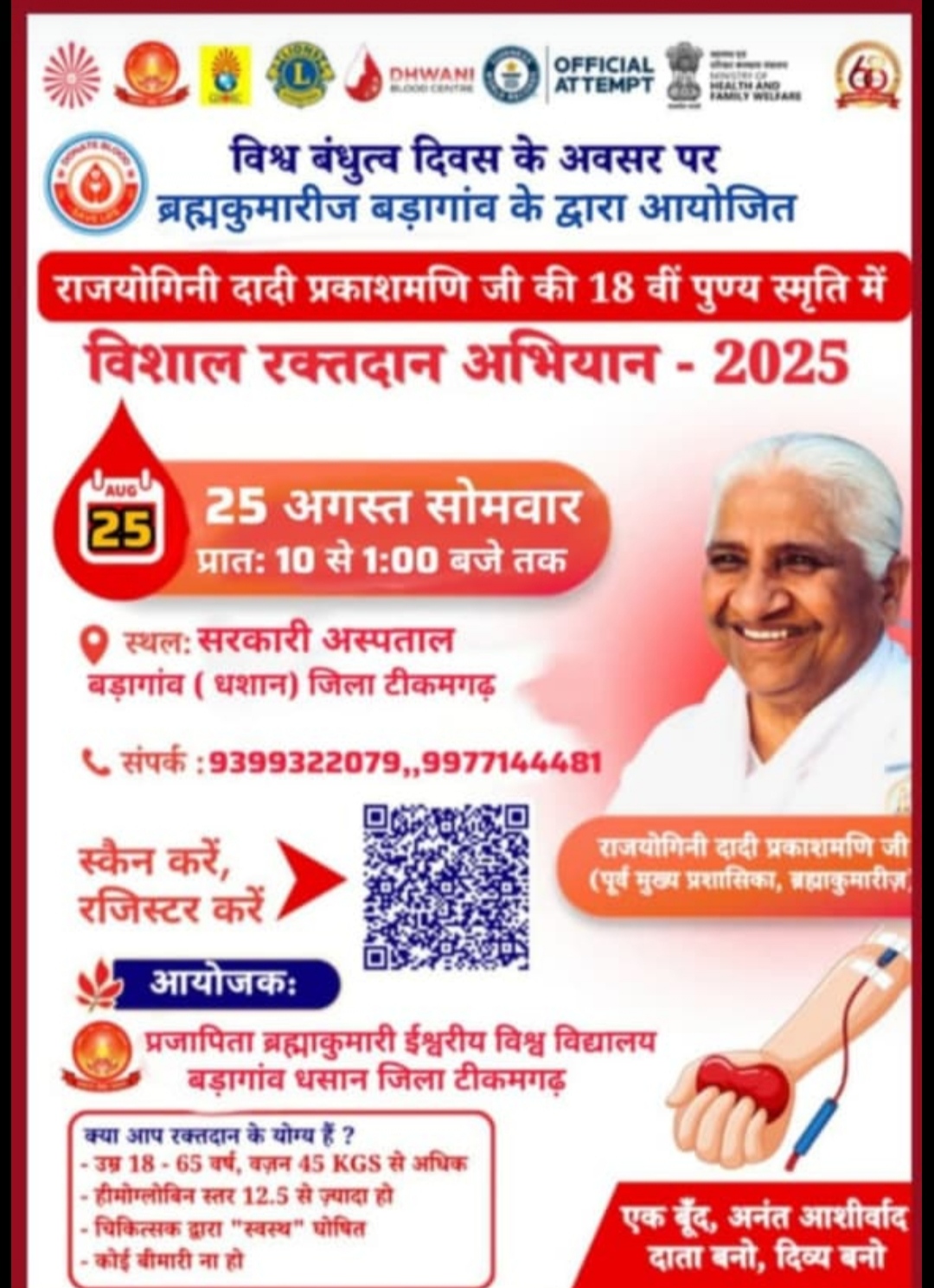 ब्रह्माकुमारीज़ अखिल भारतीय रक्तदान अभियान के अंतर्गत बड़ागांव धसान पाठशाला में 25 अगस्त को रक्तदान शिविर का आयोजन