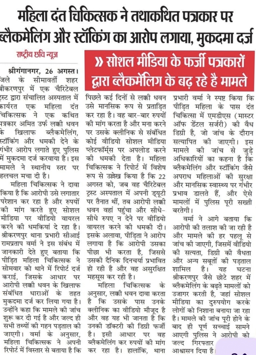 श्री करपुर की ऐक महिला दंत चिकतसक ने लक्की धवन नाम के पत्रकार पर बैलकमेकिंग औल धमकी का पुलिस मे मुकदमा दर्ज किया है|
