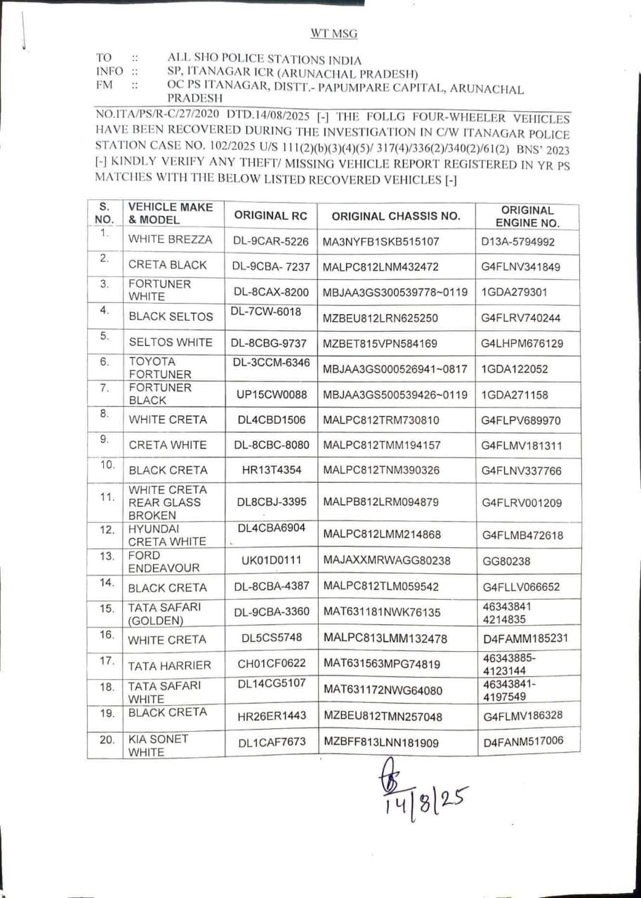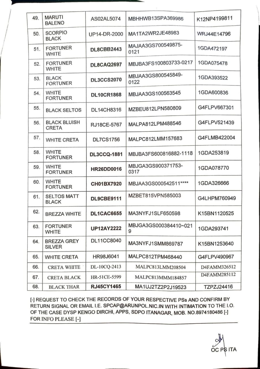 दिल्ली और आसपास से चोरी हुई 68 गाड़ियां अरुणाचल प्रदेश में बरामद हुई है | किसी की गाड़ी चोरी हुई है तो लिस्ट चेक कर सकते हैं ,,,👆👆