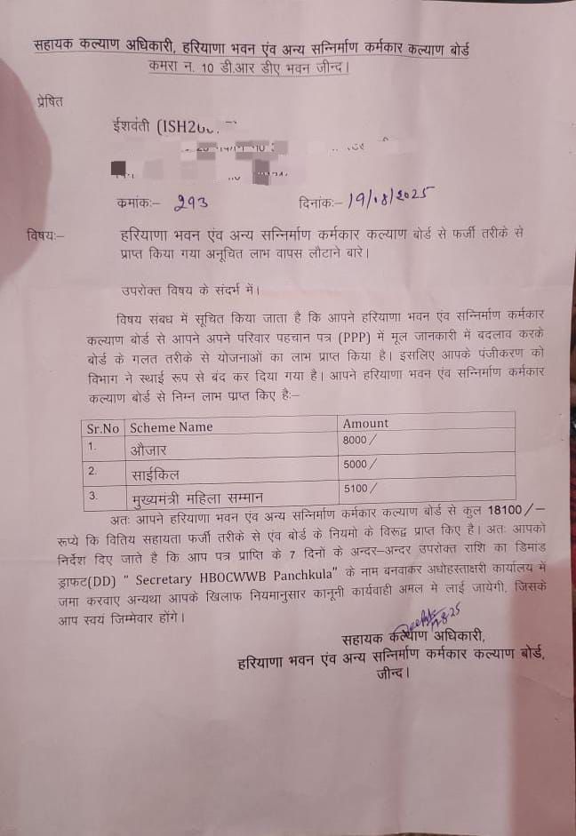 उपरोक्त विषय के संदर्भ में। विषय संबंध में सूचित किया जाता है कि आपने हरियाणा भवन एंव सन्निर्माण कर्मकार कल्याण बोर्ड से आपने अपने परिवार पहचान पत्र (PPP) में मूल जानकारी में बदलाव करके बोर्ड के गलत तरीके से योजनाओं का लाभ प्राप्त किया है। इसलिए आपके पंजीकरण को विभाग ने स्थाई रूप से बंद कर दिया गया है। आपने हरियाणा भवन एंव सन्निर्माण कर्मकार कल्याण बोर्ड से निम्न लाभ प्राप्त किए है:-