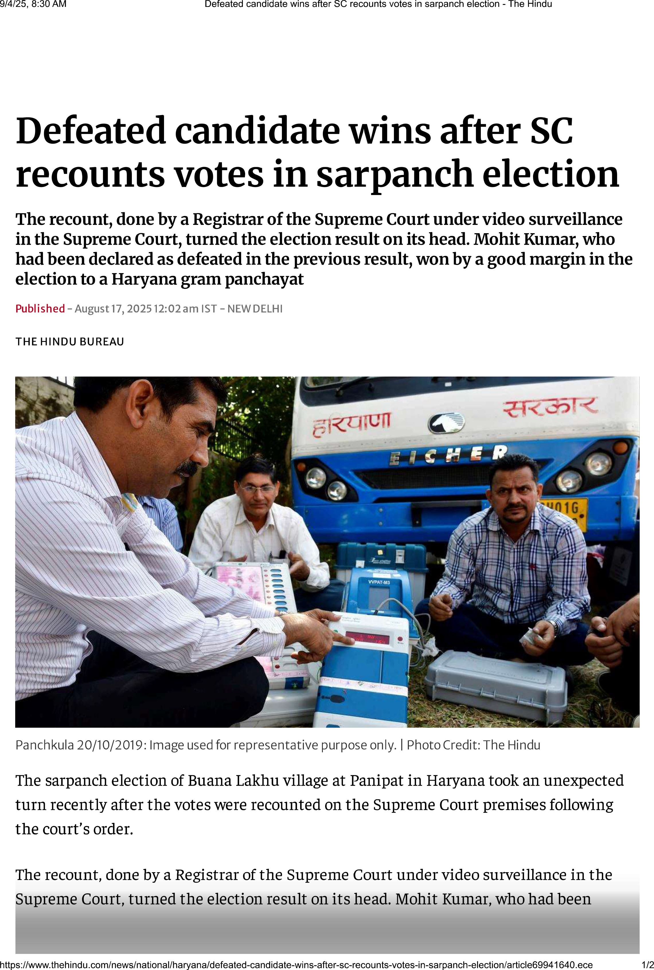 एक अभूतपूर्व मामले में सुप्रीम कोर्ट ने हरियाणा के एक ग्राम पंचायत चुनाव का परिणाम पलट दिया है. अदालत ने इलेक्ट्रॉनिक वोटिंग मशीनें (EVMs) तलब कर खुद ... https://www.aajtak.in/india/haryana/story/evm-counting-revealed-irregularities-supreme-court-overturned-the-result-of-haryana-panchayat-elections-ntc-rptc-2310702-2025-08-14